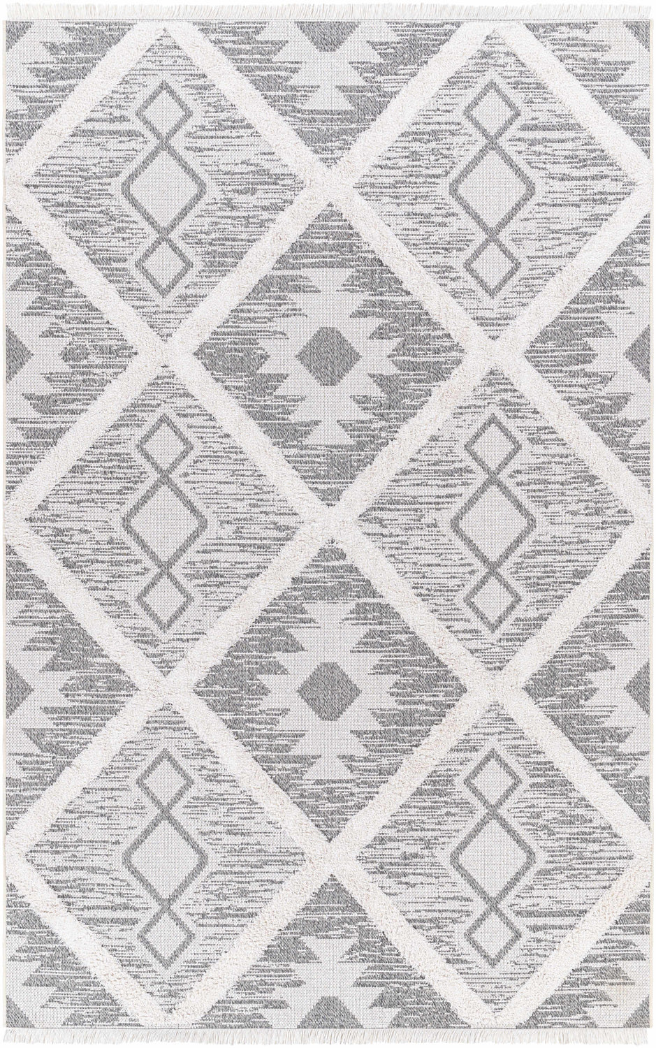 The Moto Area Rug brings bold southwestern character to any space with its striking gray and white geometric diamond pattern, layered with intricate tribal medallion motifs and a classic fringe border. Machine woven from 100% soft cotton, this rug delivers a high-pile plush feel underfoot while maintaining the crisp, graphic lines of its Aztec-inspired design. The neutral gray and cream palette makes it incredibly versatile — it pairs effortlessly with natural wood tones, white walls, and earthy decor without overwhelming a room. Fringe detailing along the edges adds a relaxed boho touch that feels both rustic and refined. At 0.59 inches thick, it has real presence and cushion underfoot. Crafted in Turkey with machine precision for lasting durability, the Moto is a great choice for living rooms, bedrooms, or any space that needs a grounded, stylish anchor. Spot clean with water only to keep it looking its best, and pair with a rug pad for added grip and longevity.