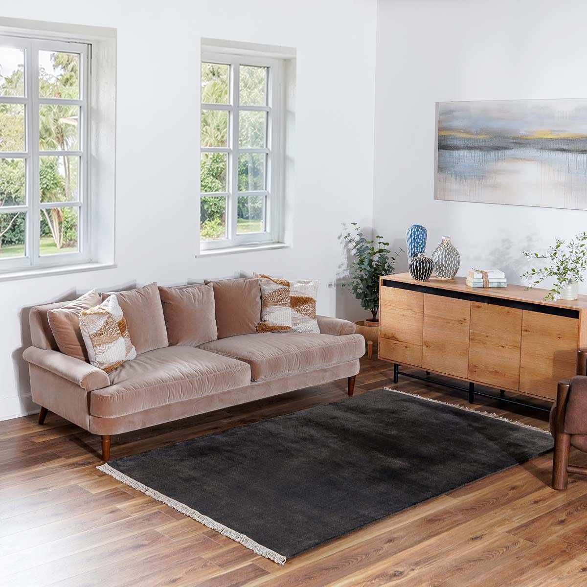 When selecting a living room rug, choose one that anchors your furniture by either placing all the legs on the rug or just the front legs, which helps define the seating area and enhances the room’s acoustics.