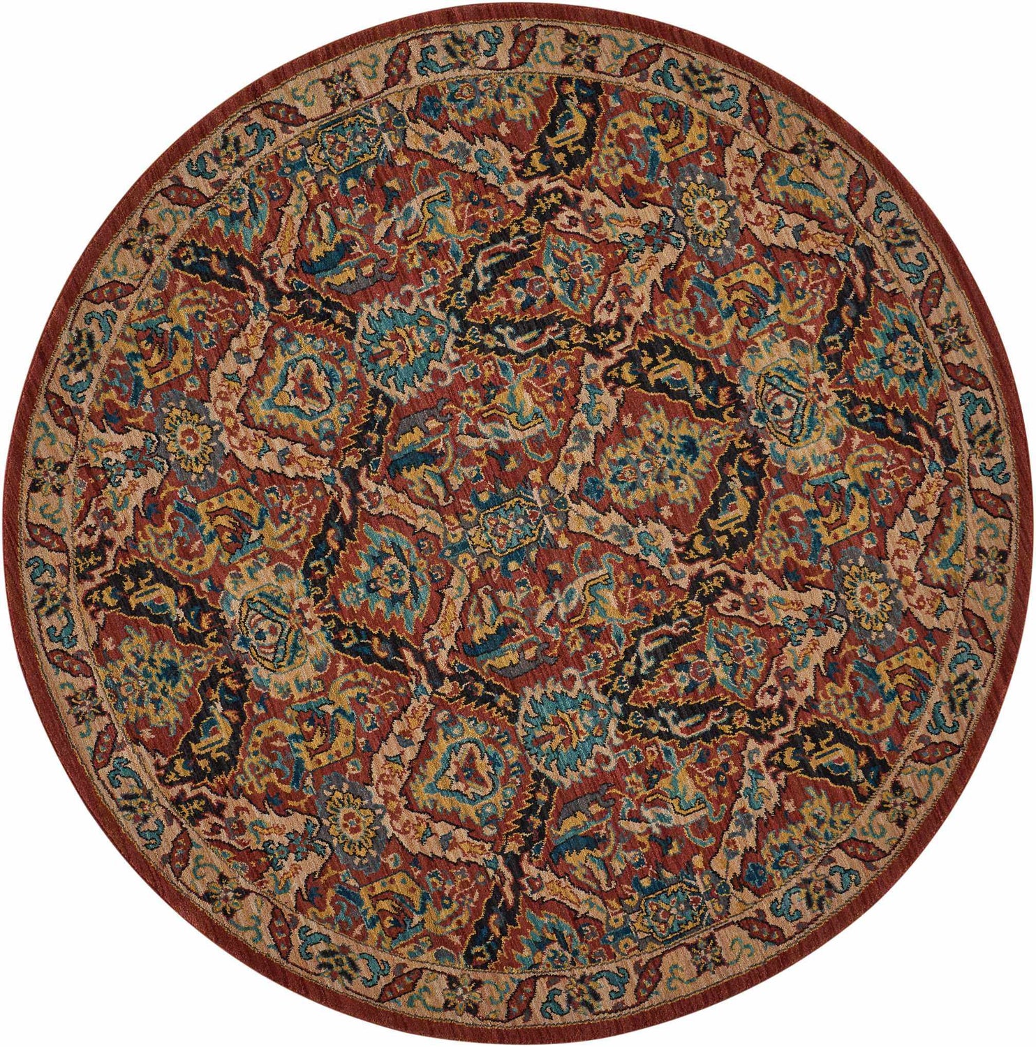 warm paletteA deep terracotta red dominates the field, warmed by earthy burgundy undertones, while vivid teal, navy blue, and golden yellow accents pop throughout the floral motifs — creating a rich, jewel-toned palette that feels both bold and classically grounded.