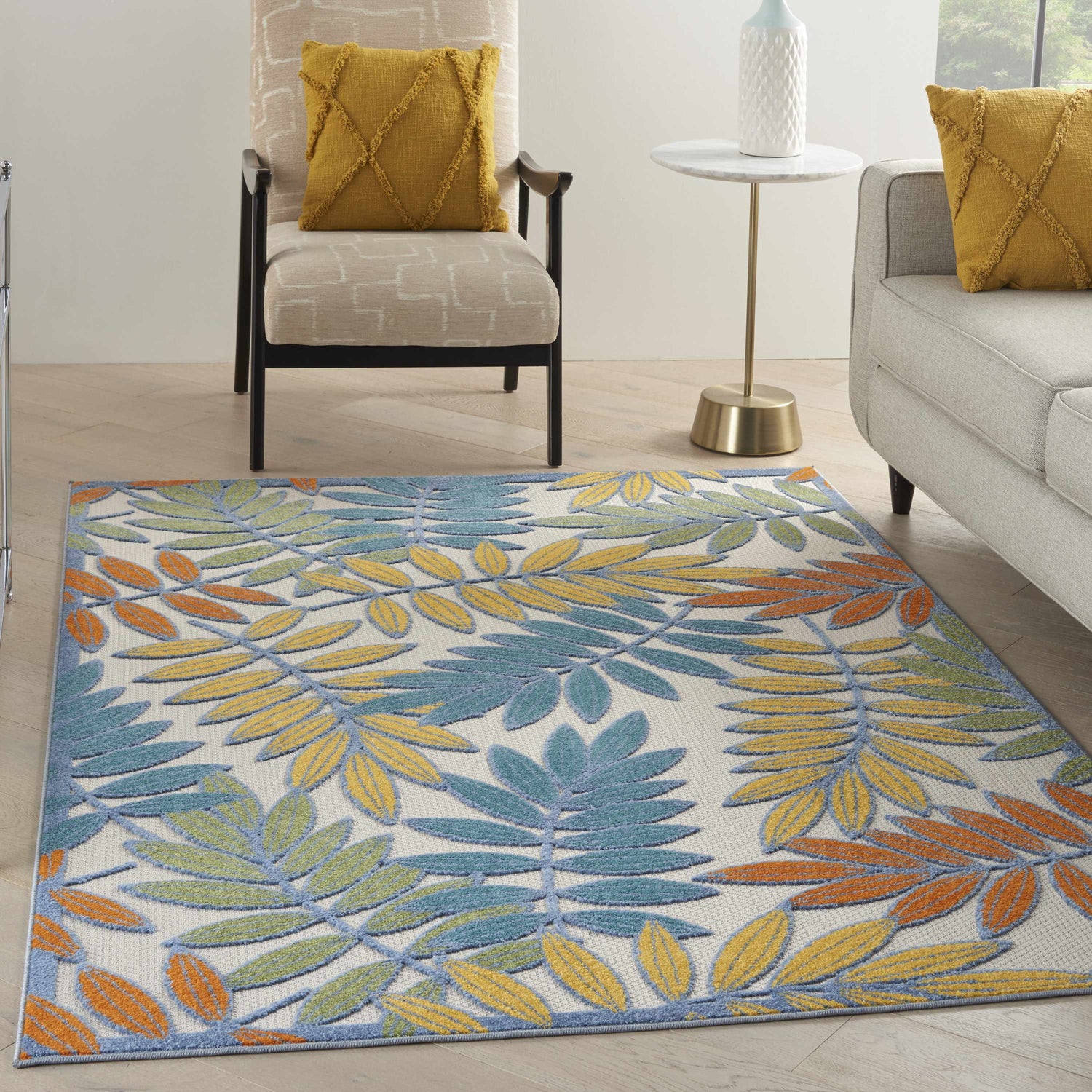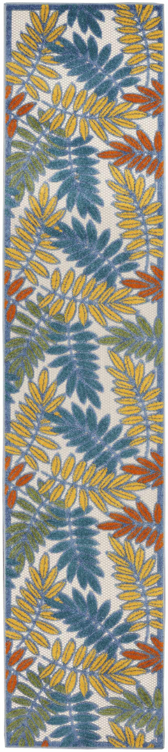 A burst of tropical color for your patio or porch — the Aloha runner layers teal, yellow, green, and orange fern leaves over a crisp ivory ground, built tough for outdoor life.