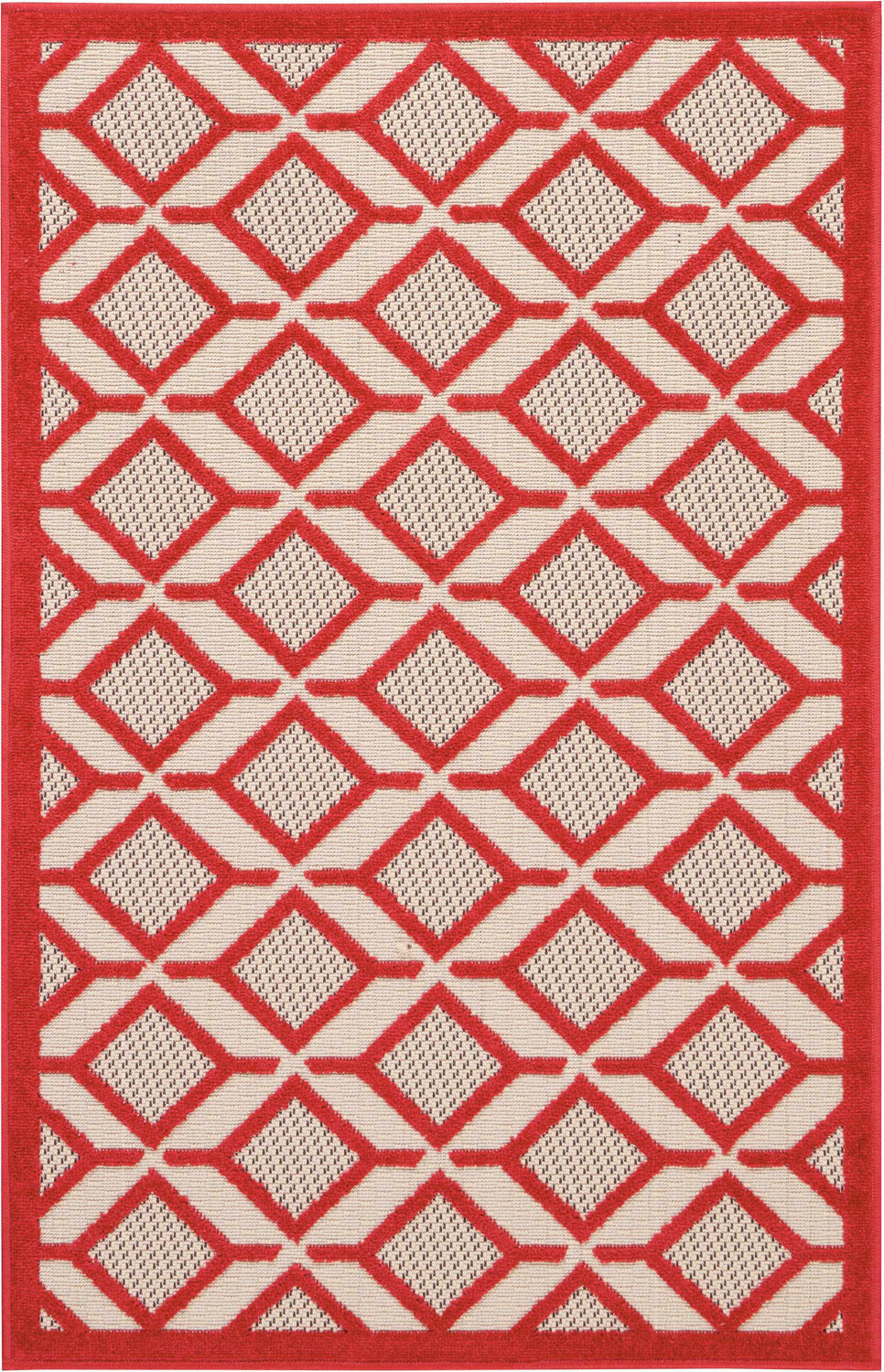 A bold red and cream diamond lattice pattern makes the Nourison Aloha a showstopper on any patio, porch, or deck — durable, weather-resistant, and ready for the outdoors.
