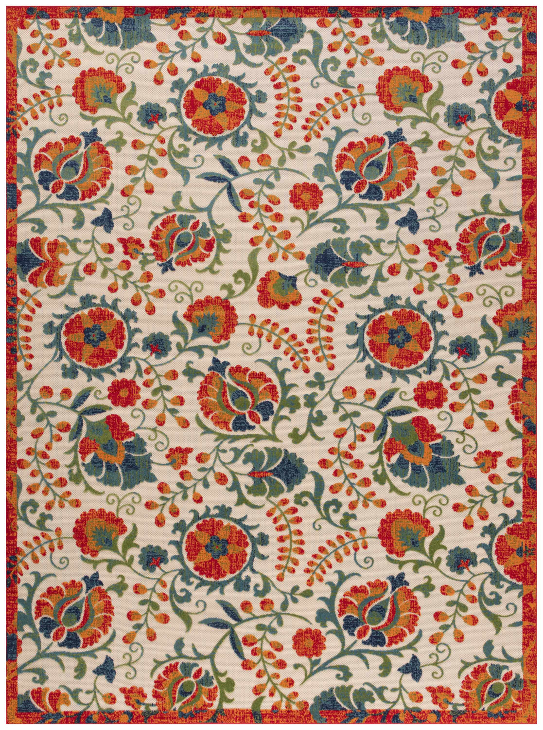 A vibrant floral outdoor rug that actually looks too good for the patio — bold red, blue, and green botanicals on a cream ground, built to handle the elements.