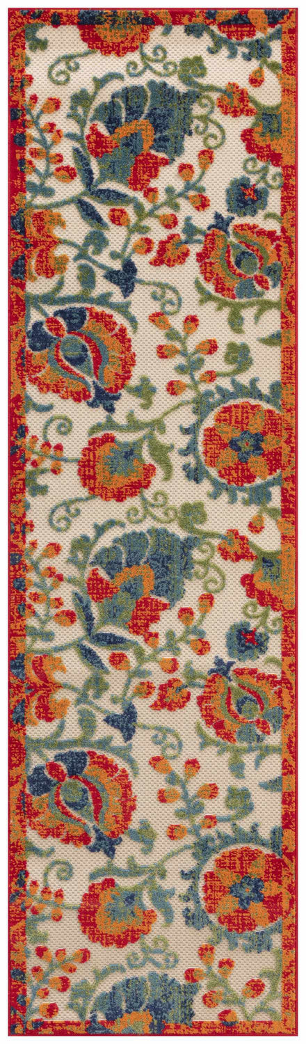 A rectangular runner-format rug with a warm cream/ivory base covered in an allover traditional floral and botanical pattern. Large stylized flowers, curling vines, and leafy scrollwork fill the field in rich jewel tones — deep red, cobalt blue, forest green, and burnt orange — with fine detailing throughout. The design is framed by a bold red border with a thin inner accent line, giving the rug a classic, finished look. The pile is very low and flat, with a smooth machine-woven surface texture typical of outdoor polypropylene construction. Edges are cleanly bound with no fringe or tassels. The overall impression is of a vibrant, traditional floral rug with a festive, garden-inspired palette.
