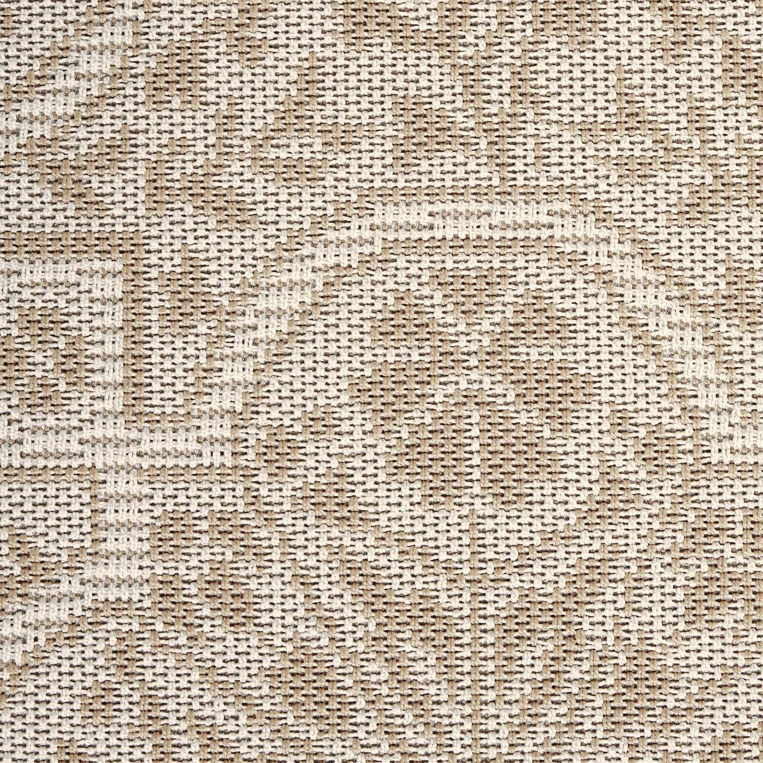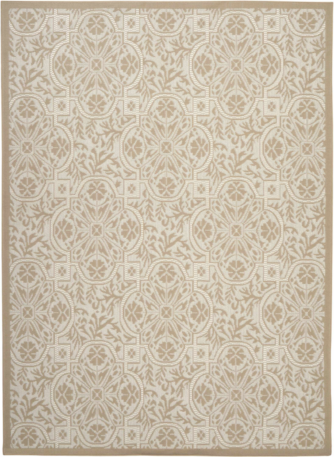The Nourison Aruba area rug brings timeless elegance to any outdoor or indoor space with its soft beige and cream tone-on-tone palette. A beautifully detailed allover floral and medallion pattern — reminiscent of classic tile work — repeats across the surface in warm sandy tones, framed by a subtle coordinating border. The muted, neutral color story makes it incredibly versatile, pairing effortlessly with natural wood, wicker, or stone furniture. Built for outdoor life, this rug is weather-resistant and crafted to handle high-traffic areas like patios, covered porches, decks, and sunrooms without sacrificing style. Its low 0.24-inch pile is easy to sweep clean and resists moisture, making it a practical choice for outdoor dining areas or entryways. Whether you're refreshing a backyard patio or adding warmth to a covered porch, the Aruba's classic floral design and durable construction deliver both beauty and function. A clearance find that looks far more expensive than it is.
