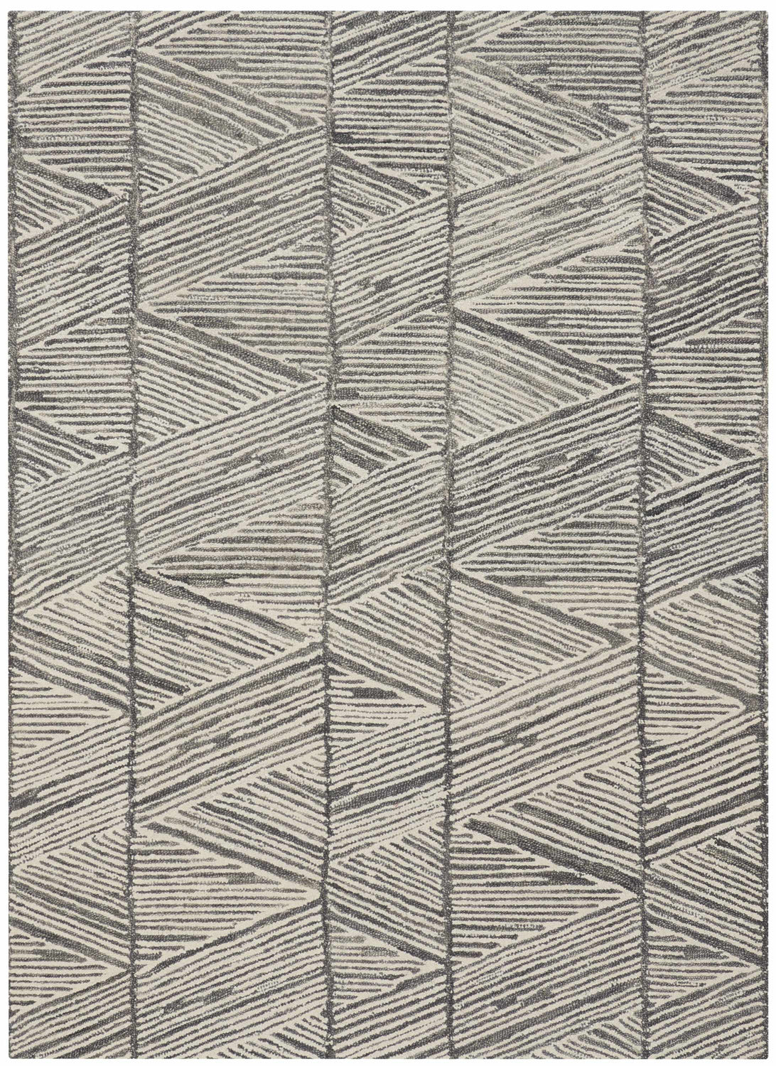 A rectangular high-pile area rug (shown in runner proportions) with a cool gray and off-white color palette. The surface is covered in an allover geometric pattern of layered diagonal lines forming triangular and diamond-like shapes — the lines are rendered in medium charcoal gray against a lighter cream-gray ground, creating a tone-on-tone, almost hand-drawn effect. A subtle vertical border panel runs down the center of the rug, framing the main field and adding a structured quality. The pile is visibly thick and textured, with a slightly raised, tufted surface that catches light and gives the pattern depth. Edges are cleanly bound with no fringe or tassels. The overall impression is of a modern, quietly sophisticated rug with a handcrafted geometric aesthetic.