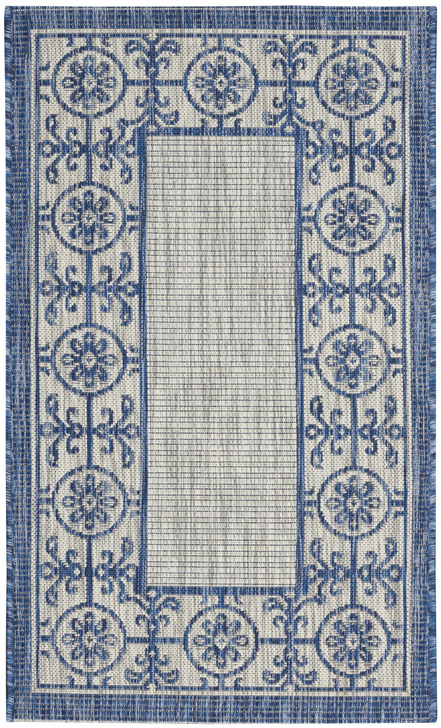 A beautifully detailed blue medallion border rug built for outdoor living — traditional elegance that's weather-resistant and durable enough for patios, porches, and beyond.