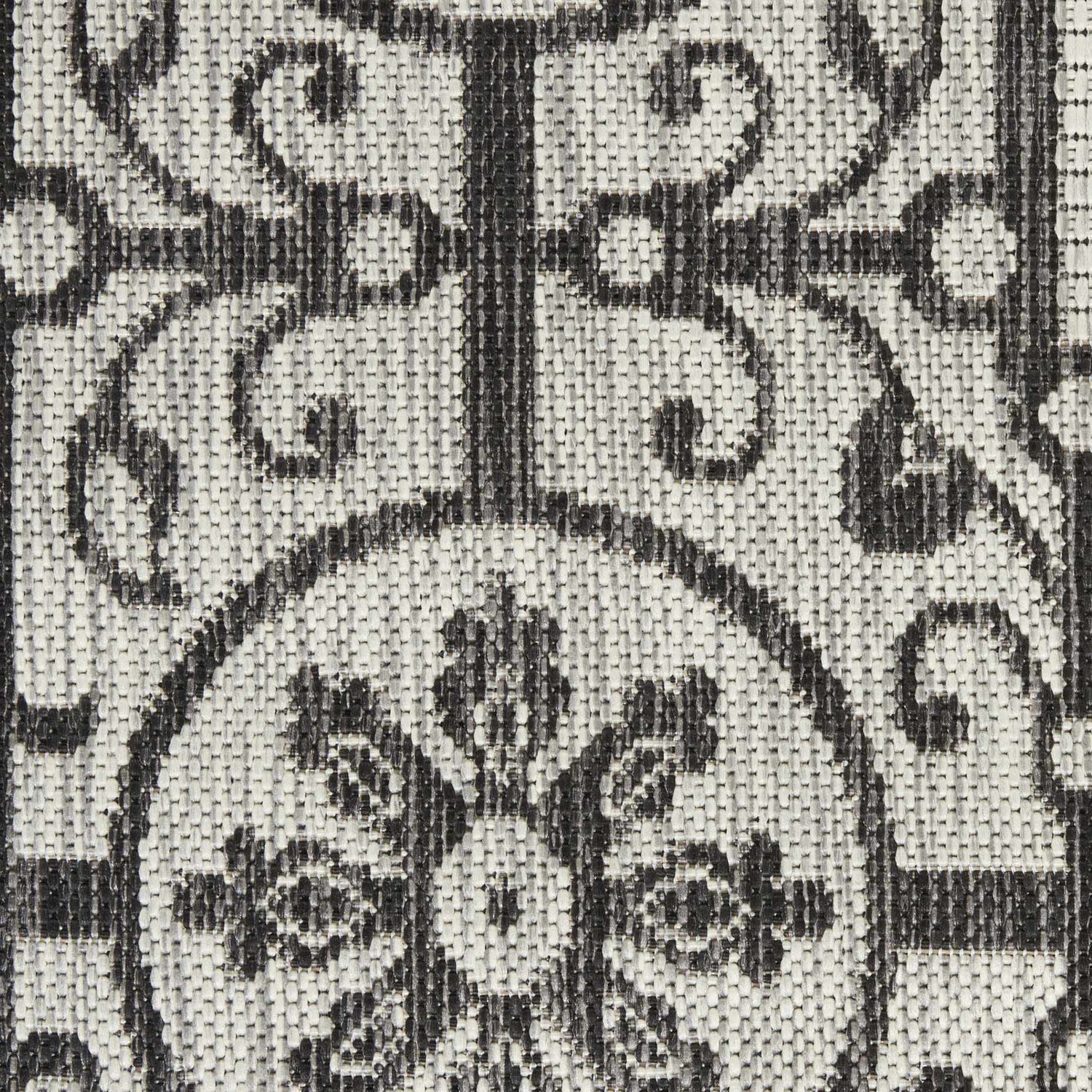 The Nourison Country Side runner brings classic charm to any outdoor or indoor space with its crisp ivory field and bold charcoal ornamental border. The border is richly detailed with repeating floral medallions, scrolling vines, and leaf motifs — a traditional pattern that feels fresh against the clean neutral background. Designed for outdoor use, this rug is built tough: the low-profile 0.25-inch pile handles foot traffic, weather, and everyday wear without fuss. The foam latex backing keeps it anchored on patios, porches, decks, and covered entryways. Its neutral ivory and charcoal palette is incredibly versatile — it layers beautifully over stone, wood, or concrete surfaces and pairs with virtually any outdoor furniture style, from farmhouse to contemporary. The runner format makes it ideal for hallways, covered walkways, and narrow porch spaces. Whether you're refreshing a front porch or defining a backyard dining zone, the Country Side delivers timeless style that holds up season after season.