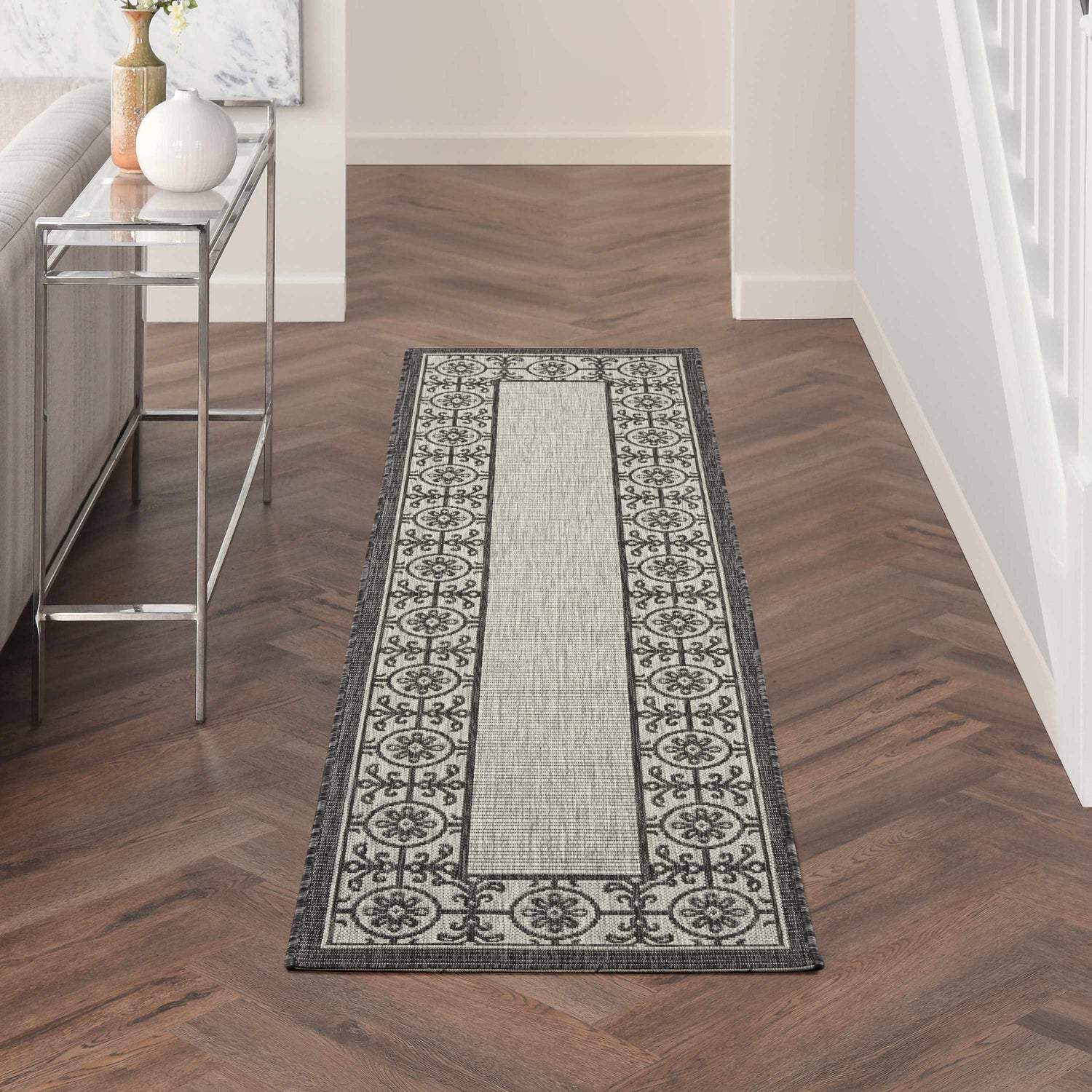 A timeless ivory and charcoal border runner with intricate floral medallion detail — outdoor-safe, durable, and effortlessly classic on any porch or patio.