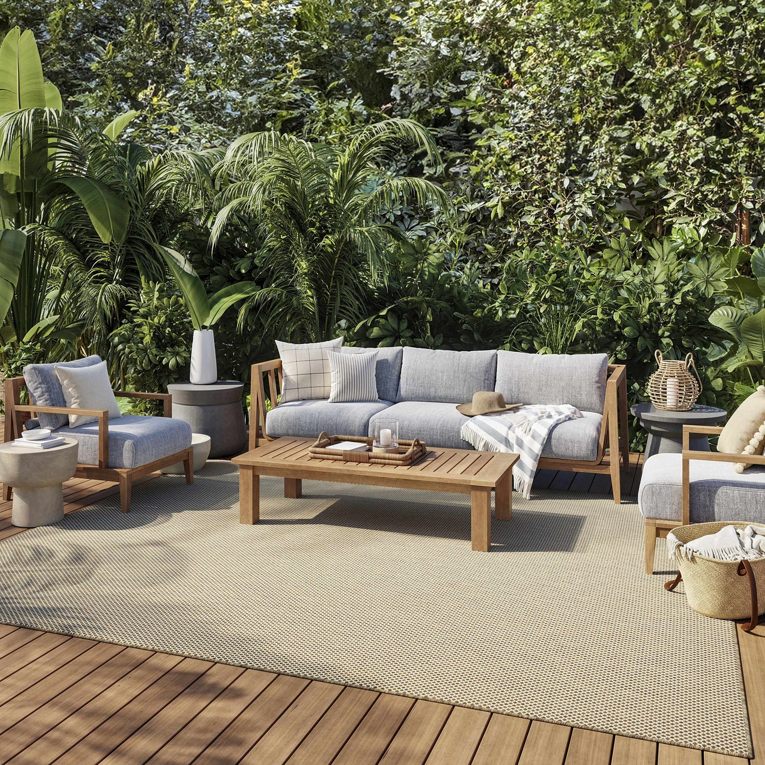 A crisp ivory diamond-weave rug built for the outdoors — UV-resistant, stain-resistant, and stylish enough to bring inside too.