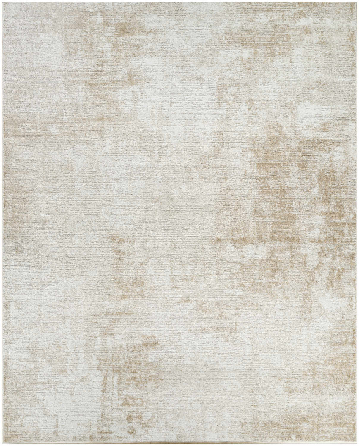 A rectangular area rug with a soft ivory base and warm beige secondary tones distributed across the entire surface in a subtle, allover abstract pattern. The design features horizontal brushstroke-like striations and faded cloud-like patches of slightly deeper beige and taupe, creating a gently distressed, washed appearance. The texture is smooth and low-profile with a tight, flat machine-woven surface. Edges are cleanly bound with no fringe or tassels. The overall impression is of a sun-bleached, quietly textured neutral rug — calm, airy, and understated with no bold motifs or borders.