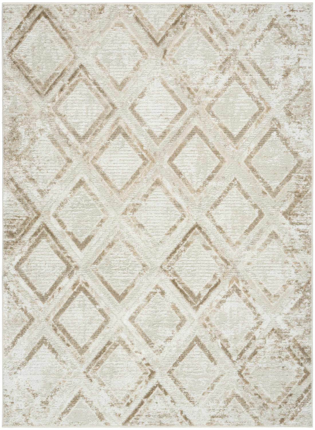 Soft ivory and warm taupe diamonds with a gently distressed finish — this low-pile Nourison Dekor rug brings quiet, modern elegance to any neutral space.