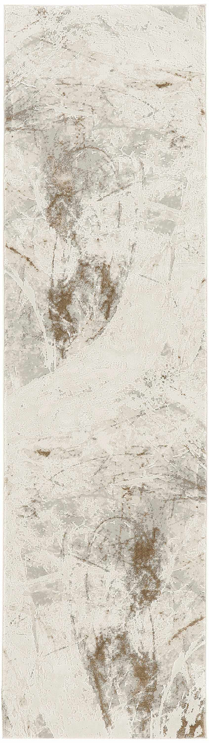 A rectangular area rug (shown here as a runner proportion) with a warm cream and ivory base. Across the surface, soft abstract markings in muted brown, taupe, and faint gray are distributed in an organic, brushstroke-like pattern — resembling aged plaster, watercolor washes, or a lightly distressed canvas. The markings are heaviest toward the center and upper portion, with lighter, more diffuse areas near the edges. The overall effect is faded and painterly rather than geometric or structured. The pile appears smooth and low-to-medium height with a machine-woven surface texture. Edges are cleanly bound with no fringe or tassels. The color palette is entirely neutral — no bold or saturated tones anywhere on the rug.