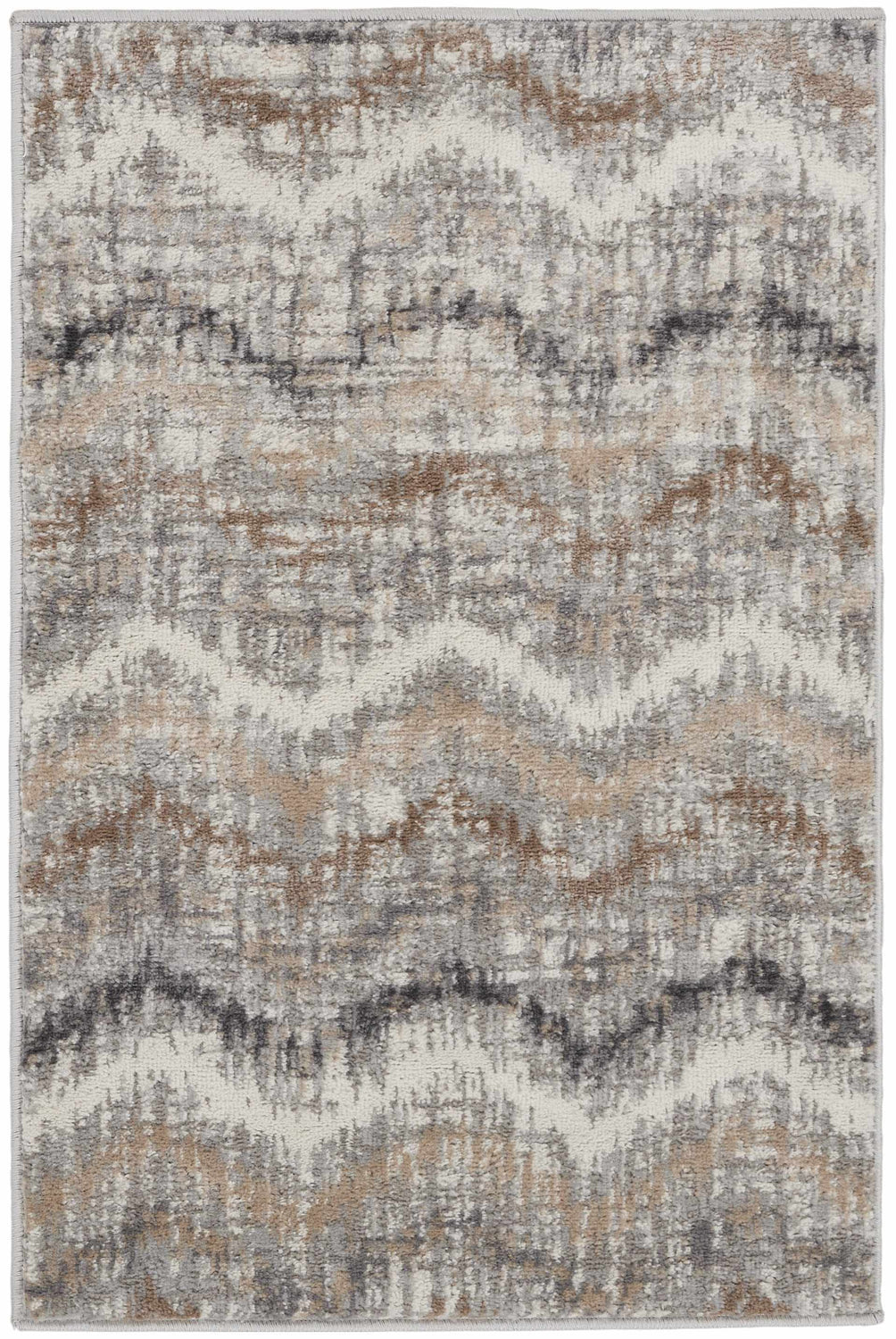 A rectangular area rug with an allover abstract distressed chevron pattern. The base palette is a blend of cool light gray and warm ivory, with sandy beige and earthy brown tones layered throughout the zigzag waves. The chevron lines are not crisp or geometric — they have a blurred, painterly, ikat-like quality as if the pattern has been softly washed or aged, giving the surface a textured, dimensional appearance. Dark charcoal accents appear subtly in the deeper shadow areas between the waves. The pile is low and smooth with a machine-woven surface texture. Edges are cleanly bound with no fringe or tassels. The overall impression is of a sophisticated, muted, neutral rug with quiet visual movement.