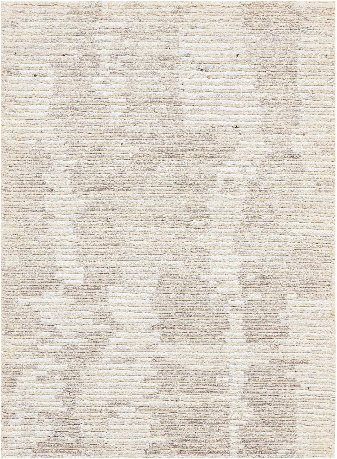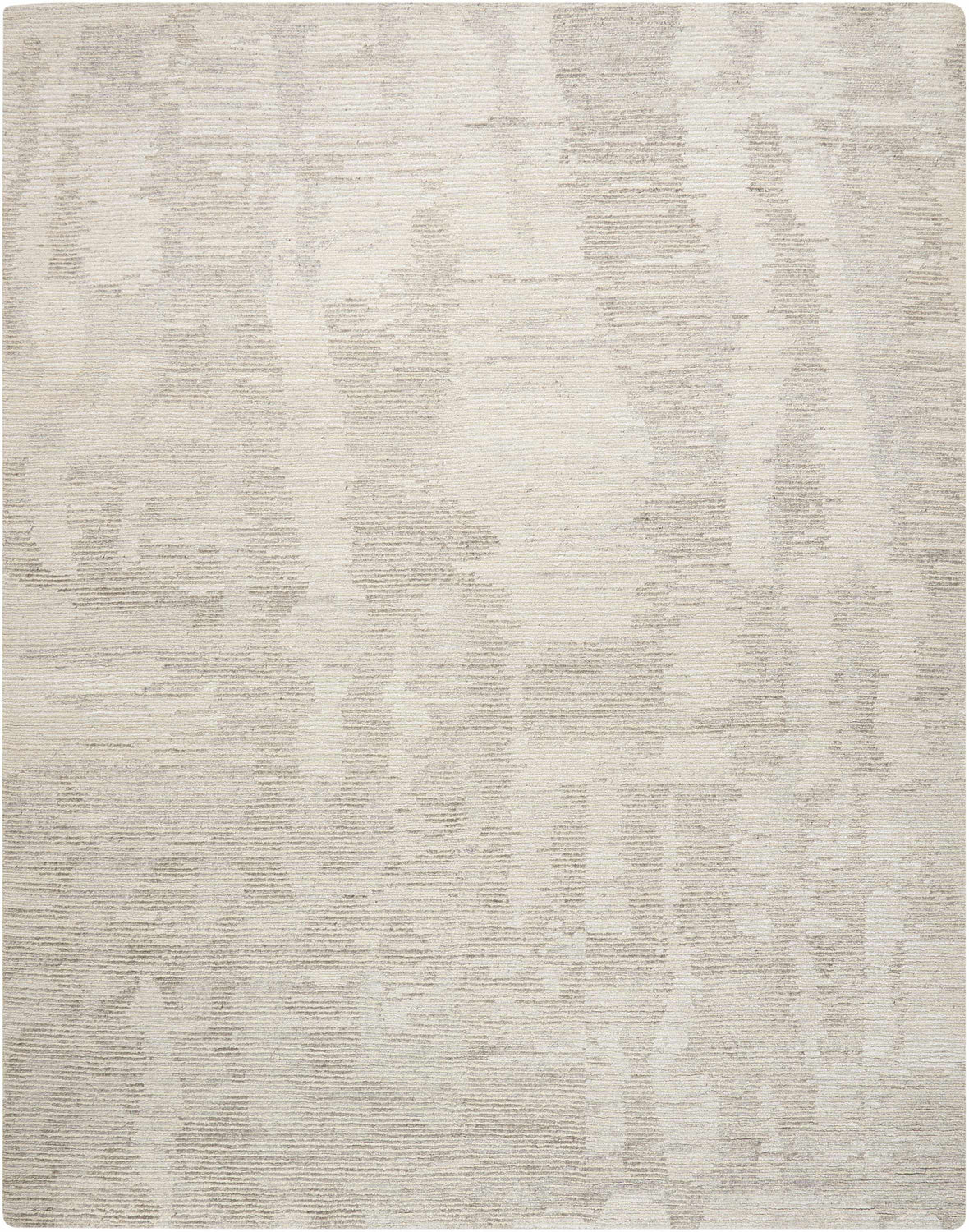 A rectangular area rug with a warm ivory base and soft taupe and beige tonal variations distributed across the entire surface in a subtle, abstract horizontal stripe-like pattern. The design has a lightly distressed, organic quality — the tonal shifts are irregular and natural-looking rather than geometric, creating a woven linen-like visual texture. The pile is medium height with a slightly textured, matte surface that catches light softly. Edges are cleanly bound with no fringe or tassels. The overall impression is of a calm, monochromatic neutral rug with quiet depth — sophisticated and understated at a glance.