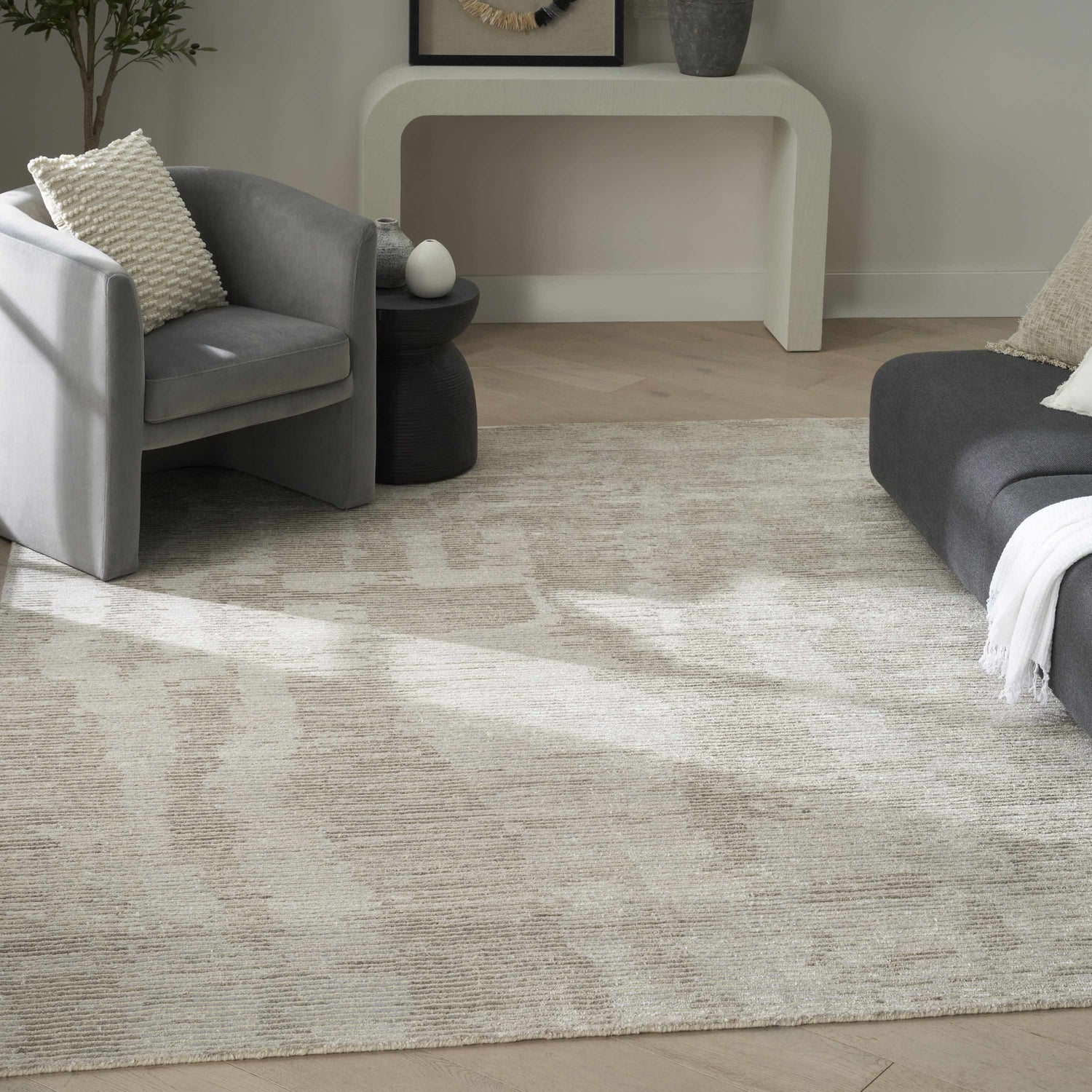 Soft ivory and taupe tones weave together in a quietly textured abstract pattern — the Ellora is the understated anchor every modern neutral room needs.