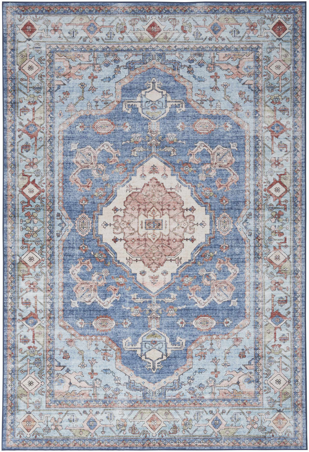 - Rich blue Persian medallion design with triple diamond centerpieces
