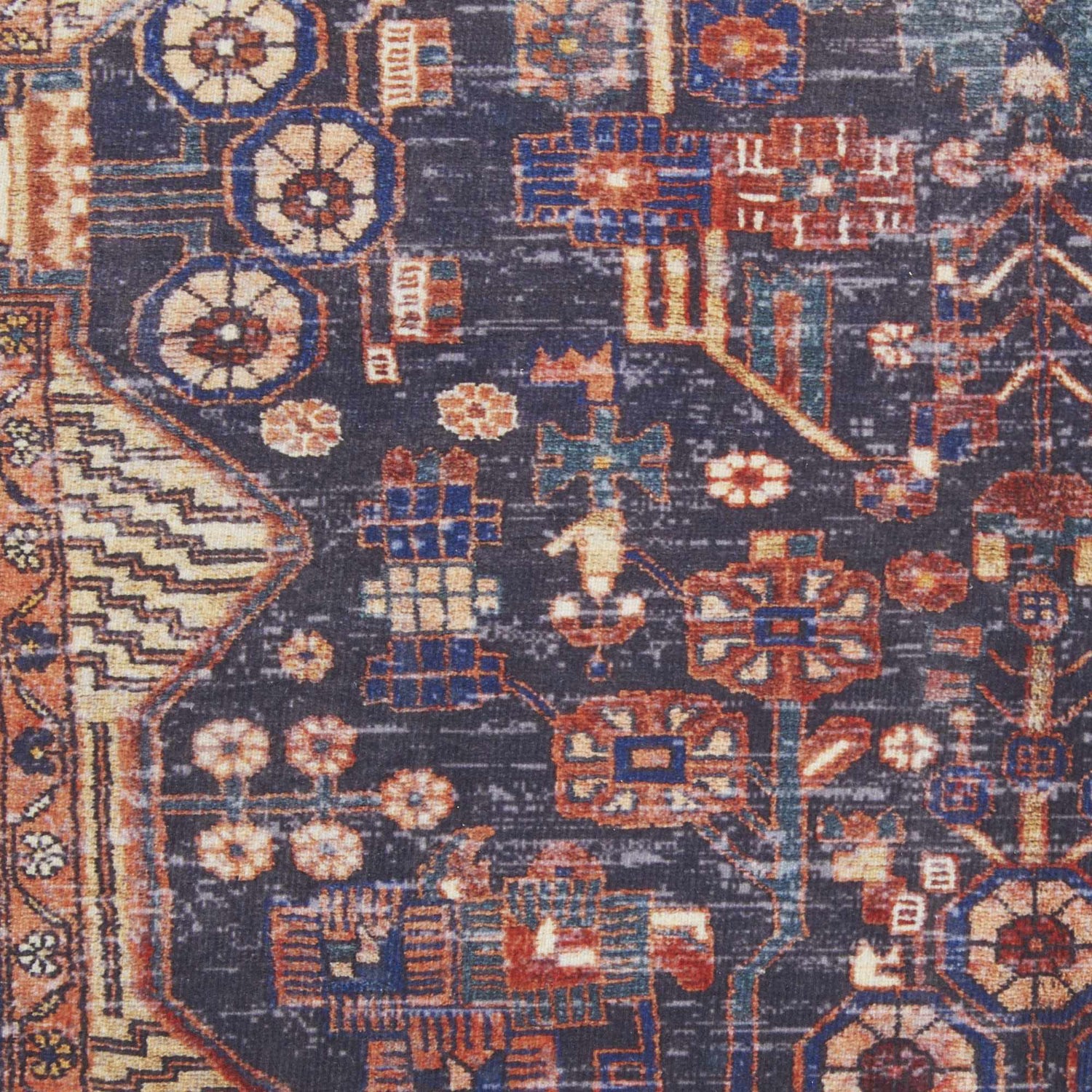 - Bold red and navy Persian floral pattern with vintage distressed finish