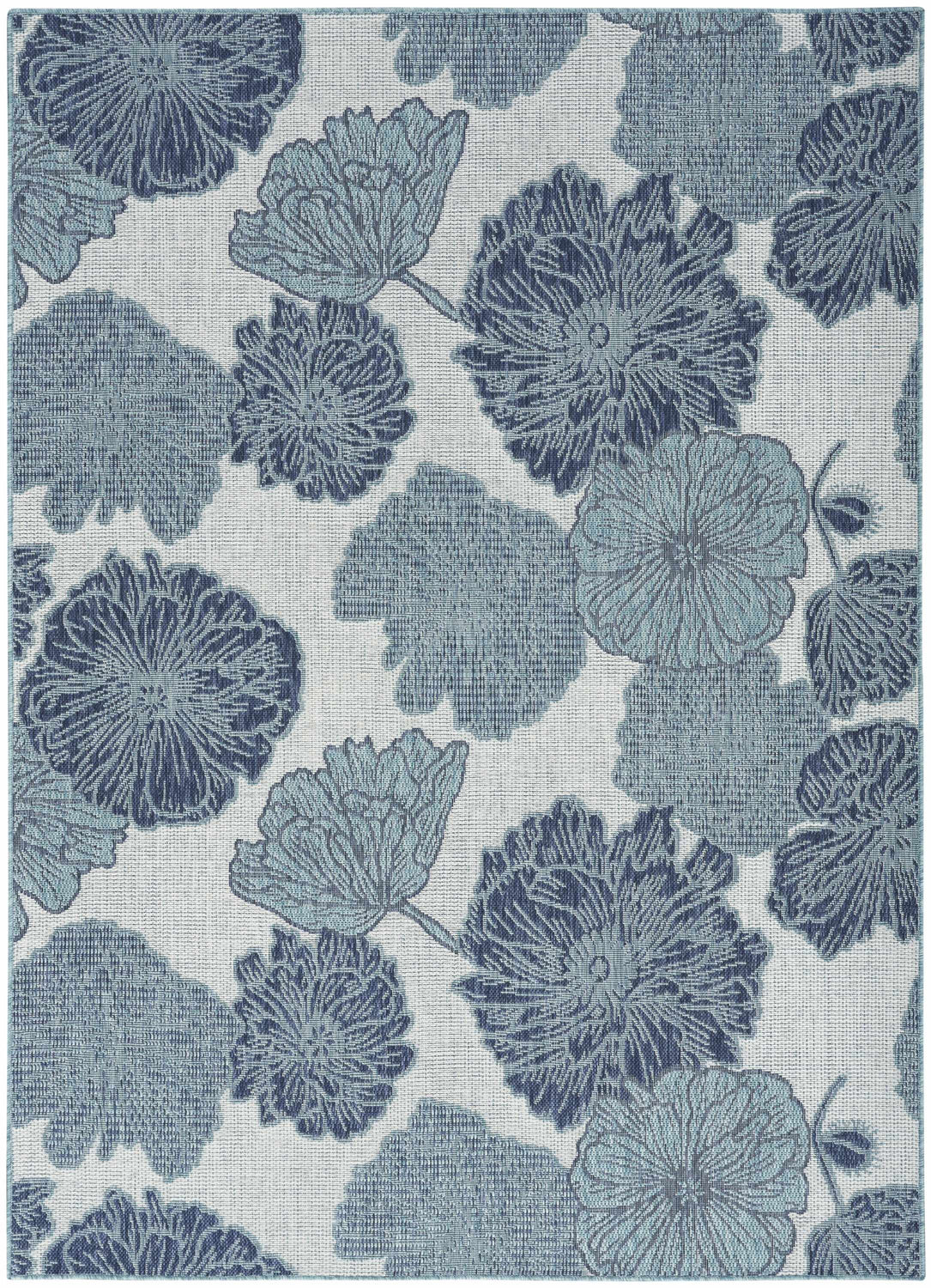 A rectangular outdoor area rug with a cream and light gray textured woven ground, covered in large-scale overlapping floral motifs — resembling oversized poppies or garden blooms — rendered in layered shades of slate blue, medium blue, and deep navy. The flowers vary in size and are scattered in an allover arrangement with no formal repeat, giving it an organic, garden-fresh feel. The pile is low and tight with a slightly textured machine-woven surface. Edges are cleanly bound with no fringe or tassels. The overall impression is bold yet serene — a cool blue botanical pattern that reads as both decorative and relaxed.