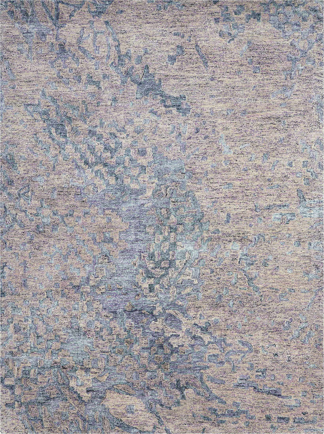 A cool, painterly palette where slate blue dominates, softened by warm beige and muted gray undertones, with subtle hints of teal and lavender that emerge like brushstrokes — giving the rug an almost atmospheric, watercolor quality.