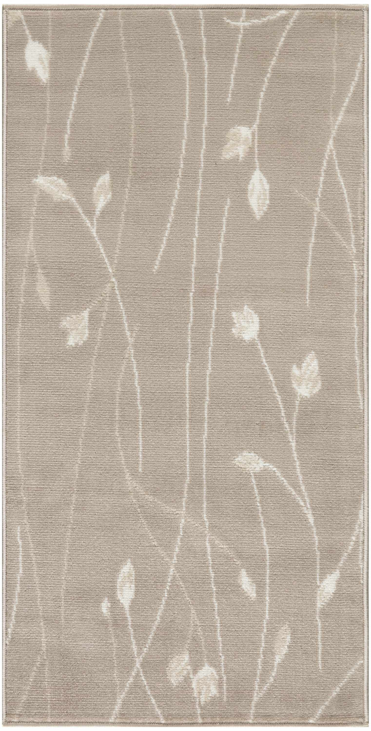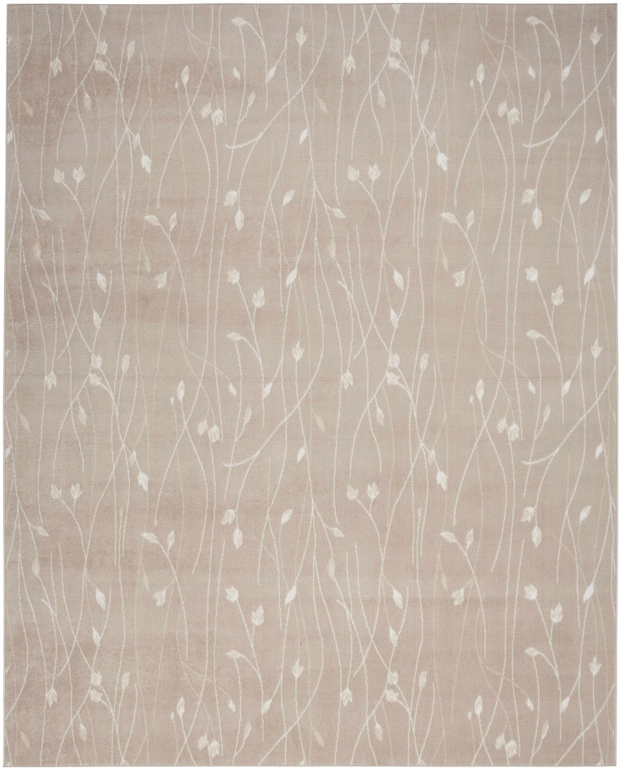 A rectangular area rug with a warm beige/taupe ground and an allover botanical pattern of slender, curving stems with small pointed leaves rendered in soft cream and off-white. The motifs are distributed across the entire field in a loose, organic arrangement — stems rise vertically with gentle curves, and small teardrop-shaped leaves branch off at intervals. The design is tone-on-tone, with the cream pattern only slightly lighter than the beige background, creating a subtle, sophisticated effect. The pile is smooth and medium-height with a machine-woven surface texture. Edges are cleanly bound with no fringe or tassels. The overall impression is calm, airy, and nature-inspired.