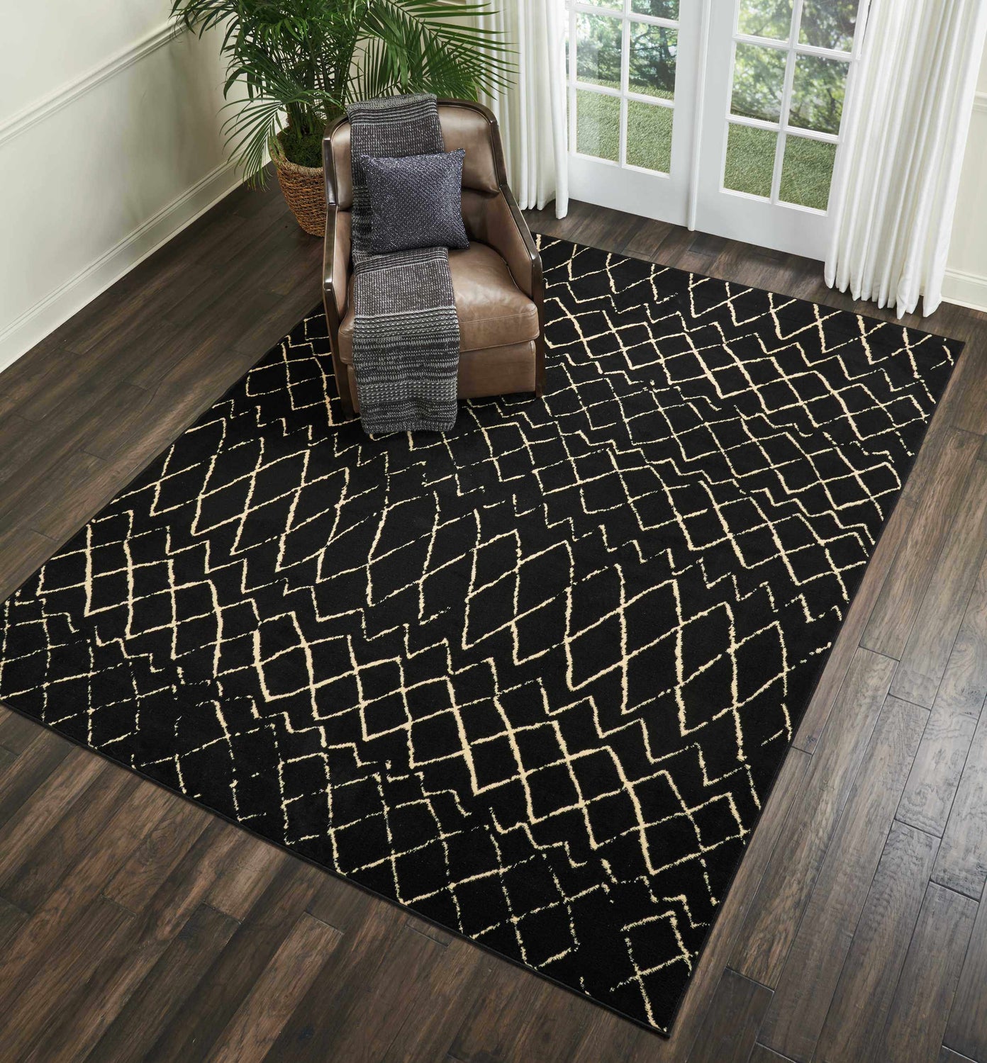 - Striking black base with hand-drawn beige diamond lattice pattern