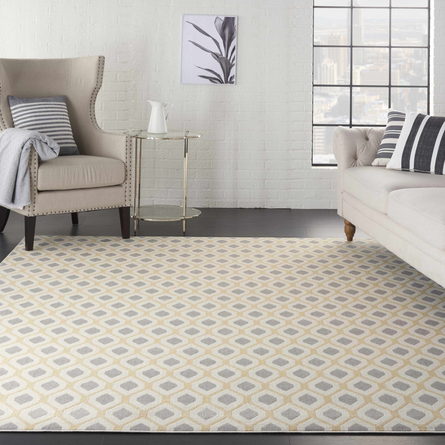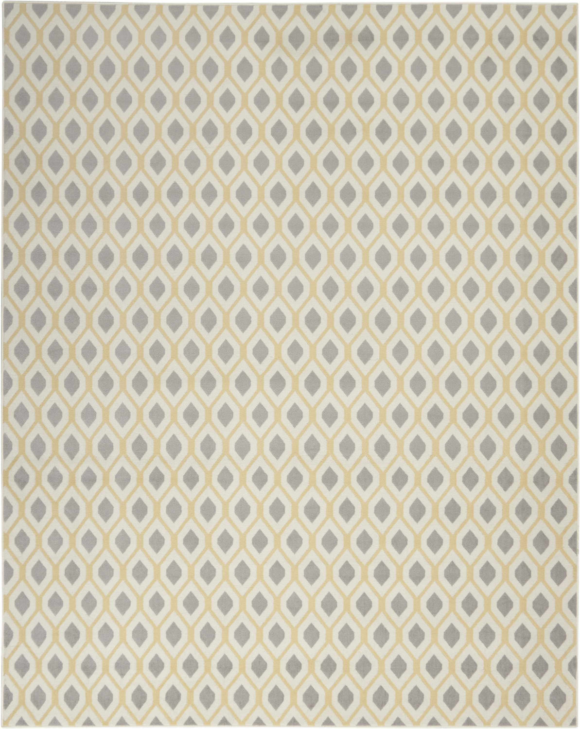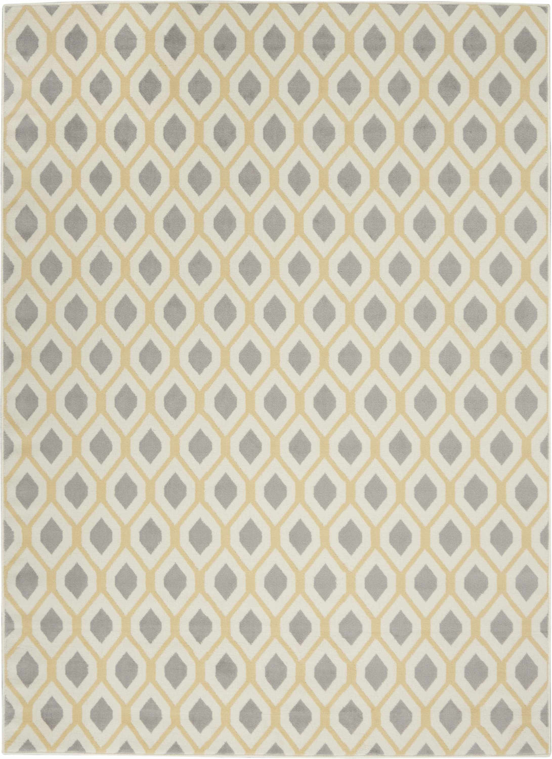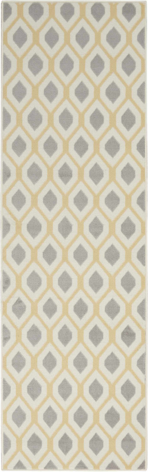 The Nourison Grafix runner brings a fresh, modern energy to any hallway or entryway with its bold ikat-inspired geometric pattern. Soft gray teardrop motifs repeat across a creamy ivory field, framed by warm golden-yellow outlines that give the design a subtle pop of color without overwhelming the space. The palette is effortlessly neutral — gray, cream, and mustard yellow work together to complement a wide range of interiors, from contemporary to transitional. At 0.5 inches of medium pile, this runner offers a comfortable underfoot feel while remaining low-profile enough for high-traffic areas. The foam latex backing keeps it firmly in place on hard floors. Whether you're layering it over a larger rug or letting it anchor a narrow hallway, the Grafix runner's clean geometric lines and muted tones make it a versatile, stylish choice that feels both collected and effortless.