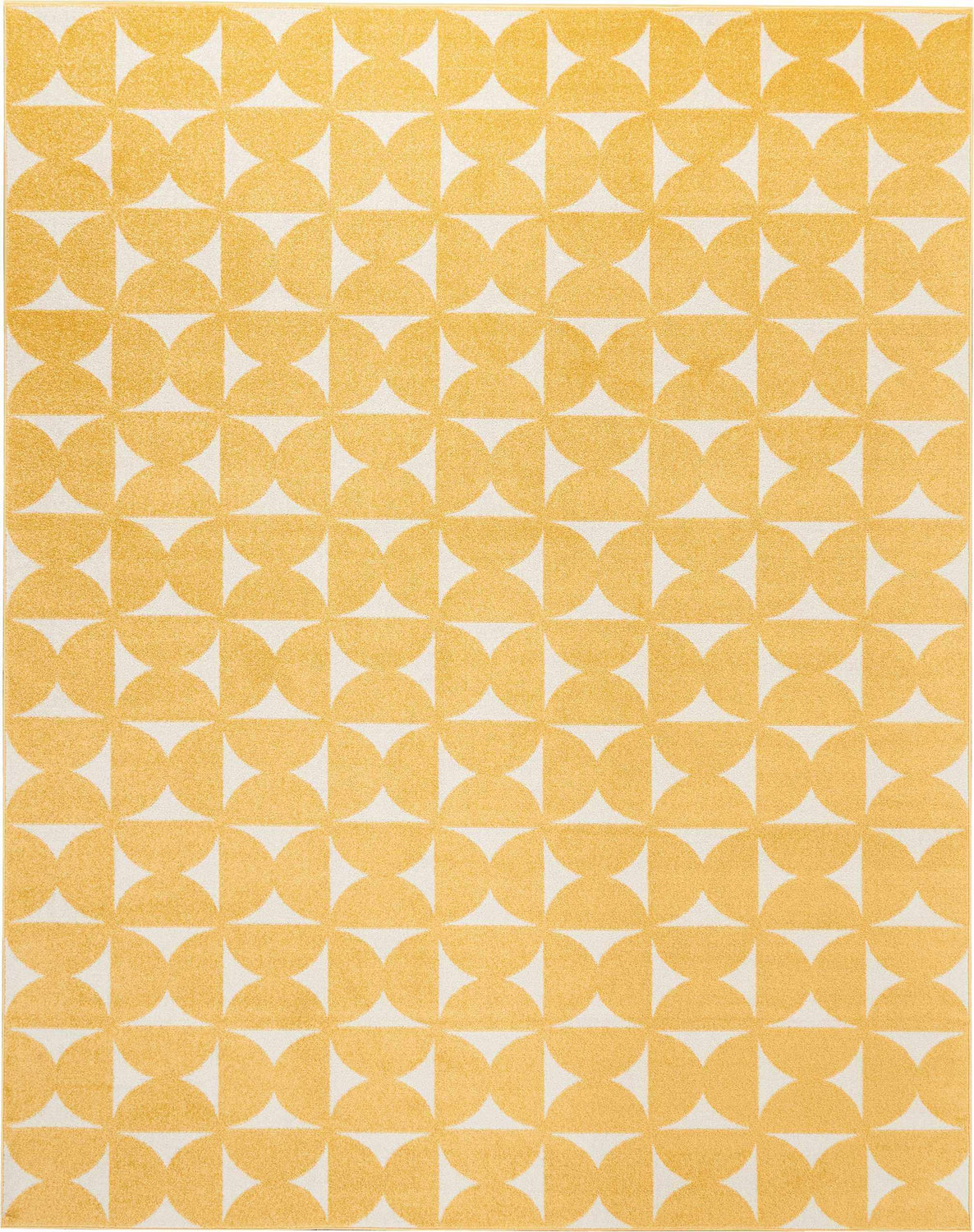Bold mustard-yellow geometric tiles repeat across a cream background — the Nourison Harper is a retro-modern statement piece that instantly warms any room.