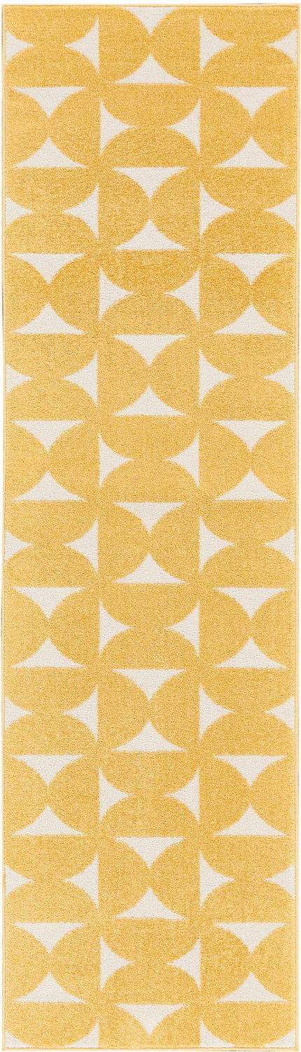 A rectangular runner-proportioned area rug with a bold, repeating geometric tile pattern. The background is a warm cream/off-white, and the pattern consists of interlocking circular arc motifs — each tile unit formed by four curved quarter-circle shapes meeting at a center point — rendered in a rich mustard yellow with a slightly textured, woven surface appearance. The pattern repeats uniformly in a tight grid across the entire rug surface with no border. The pile is low and smooth with a machine-woven texture. Edges are cleanly bound with no fringe or tassels. The overall visual impression is graphic, retro, and cheerful — reminiscent of mid-century modern tile work.