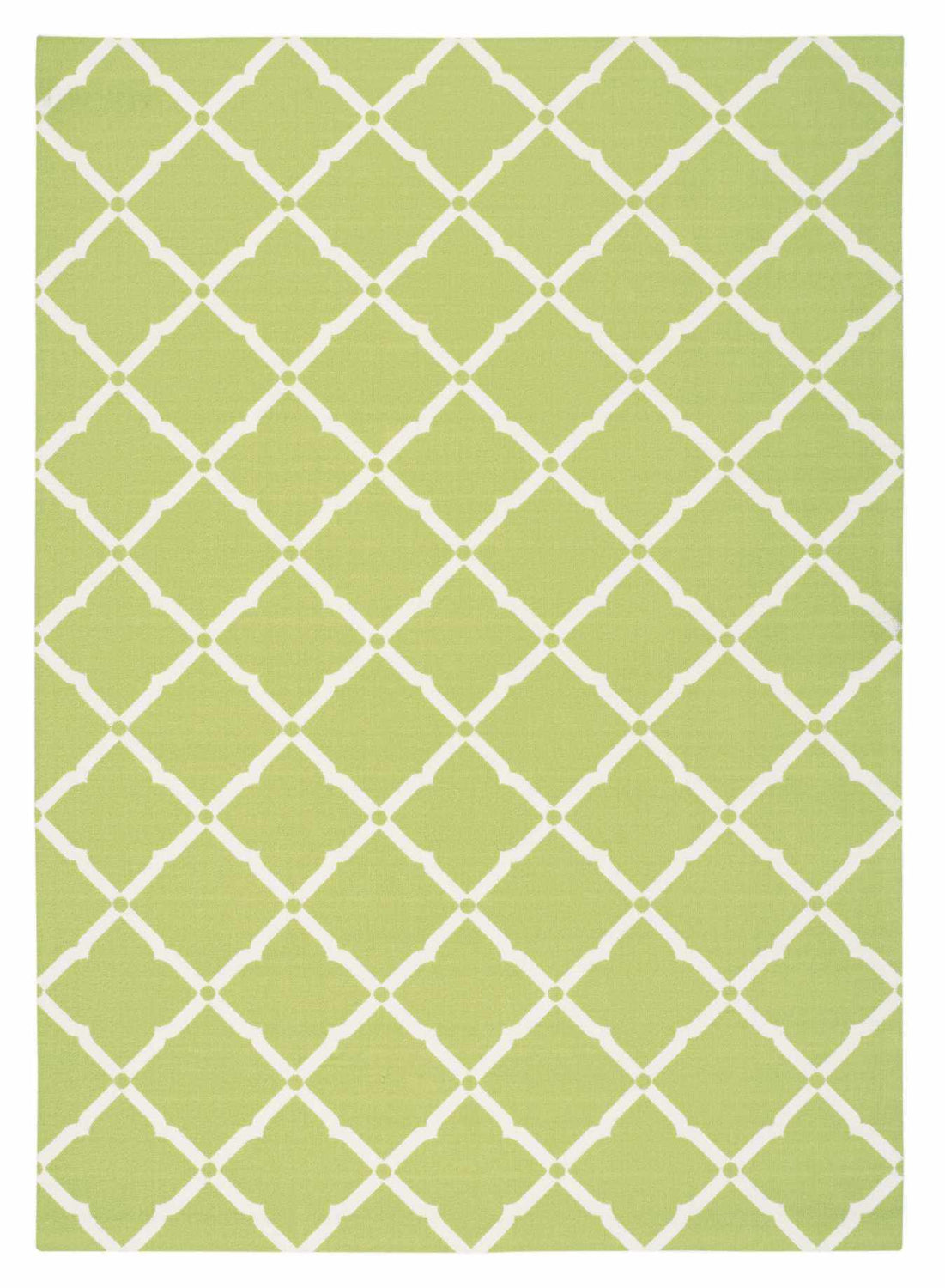 A fresh light green trellis rug that transforms any patio or porch — durable polypropylene construction stands up to sun, rain, and heavy foot traffic.