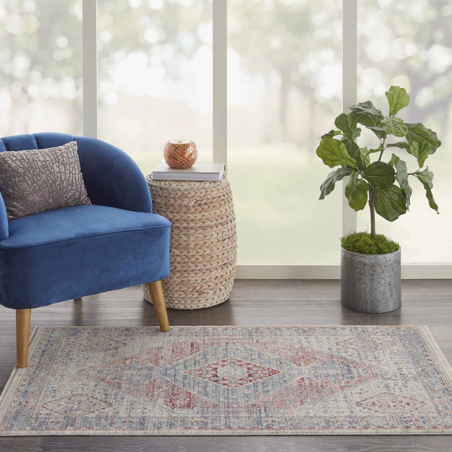 A beautifully faded diamond medallion runner in soft gray, blue, and rust — traditional character with a worn-in finish that feels right at home in farmhouse and transitional spaces.