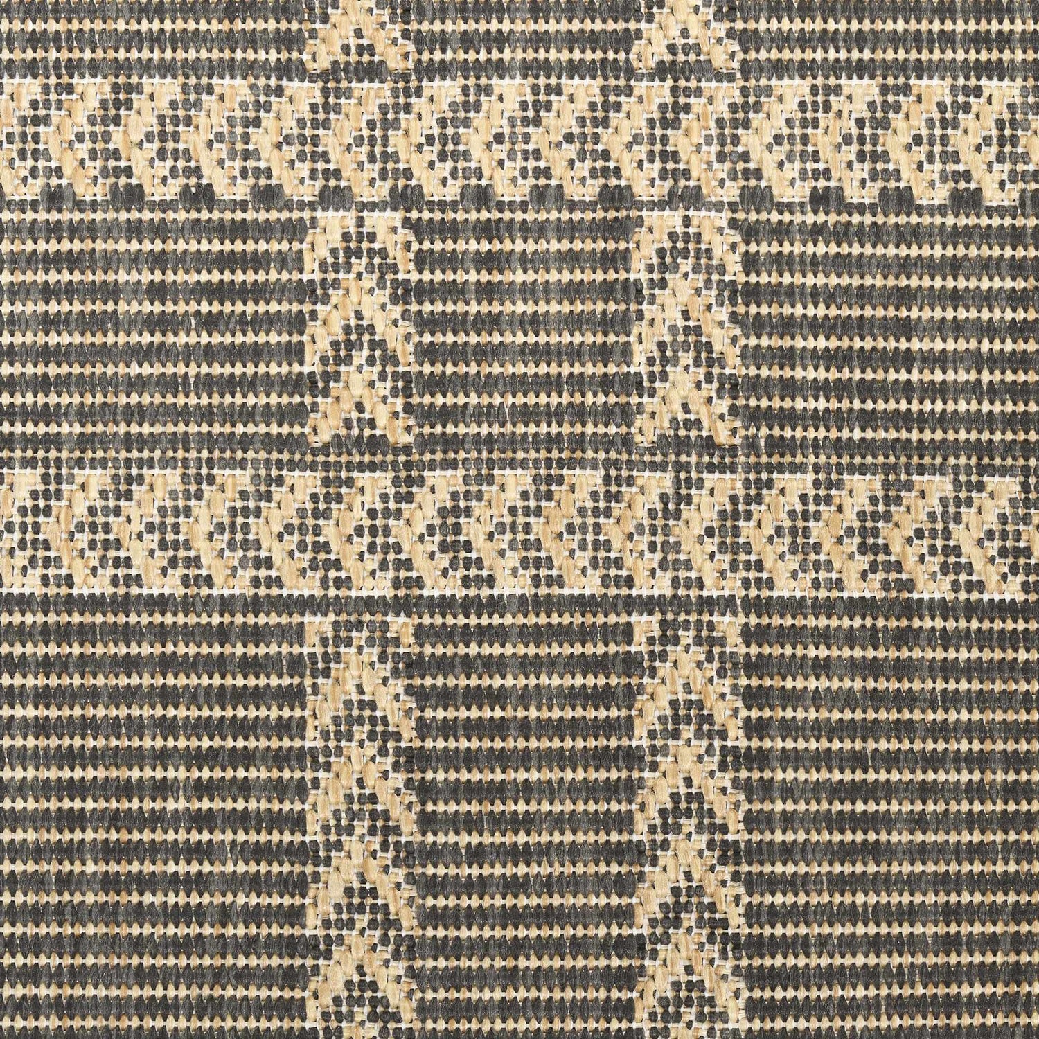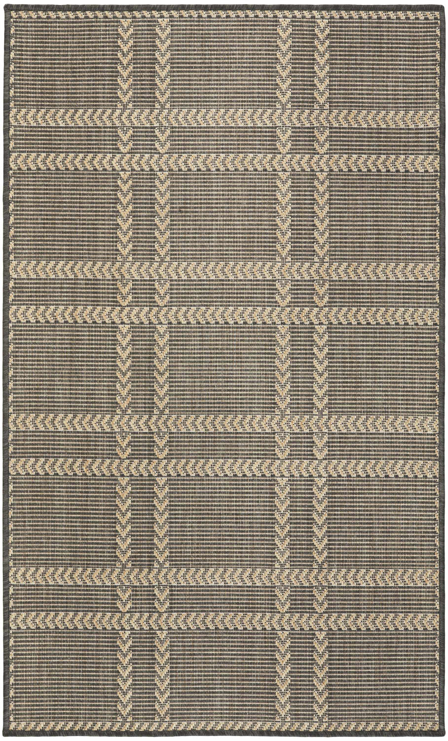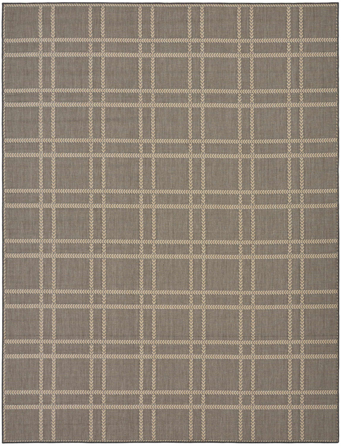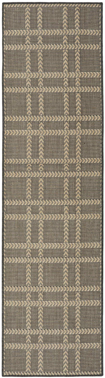 A crisp charcoal and beige plaid grid with subtle arrow detailing — this outdoor-safe Nourison Horizon rug is as durable as it is stylish, perfect for patios, porches, and entryways.