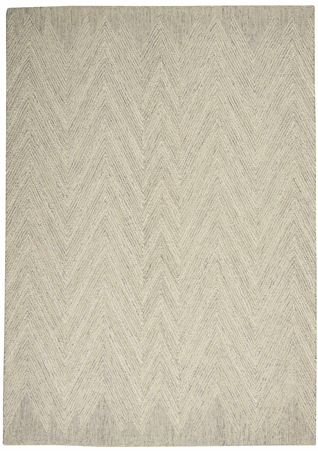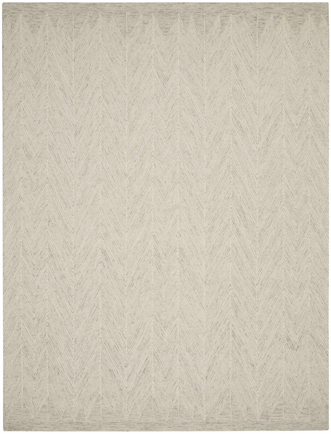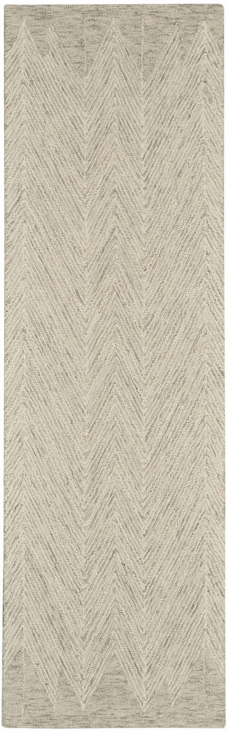 A rectangular runner-format rug with an allover herringbone pattern rendered entirely in a tone-on-tone palette of warm ivory and soft gray. The V-shaped zigzag rows run vertically along the length of the rug, with the ivory forming the dominant base and the gray creating the interlocking diagonal lines. The surface has a medium pile with visible texture — the woven construction gives it a slightly handcrafted, dimensional appearance rather than a flat machine-printed look. Edges are cleanly bound with no fringe or tassels. The overall impression is calm, understated, and quietly sophisticated — a neutral workhorse with genuine visual interest.