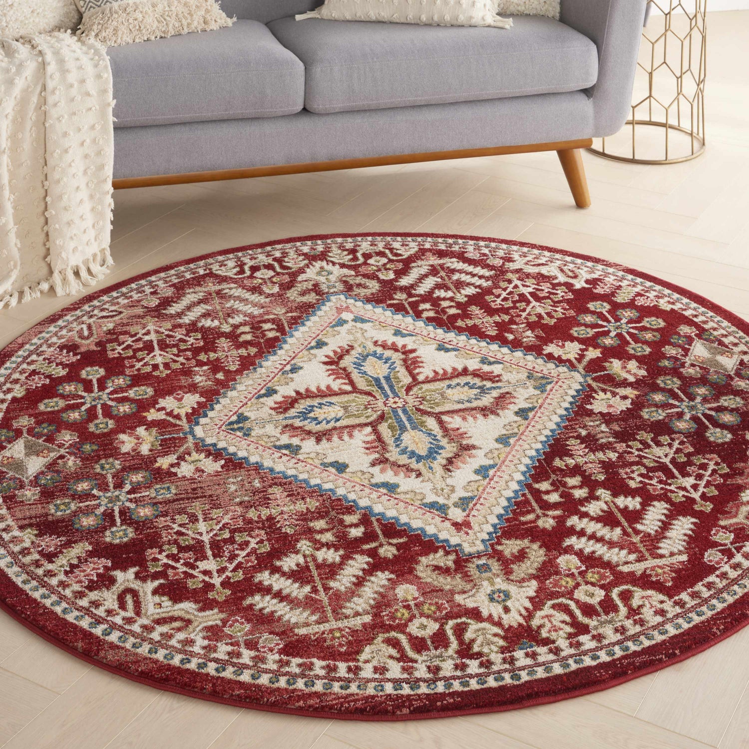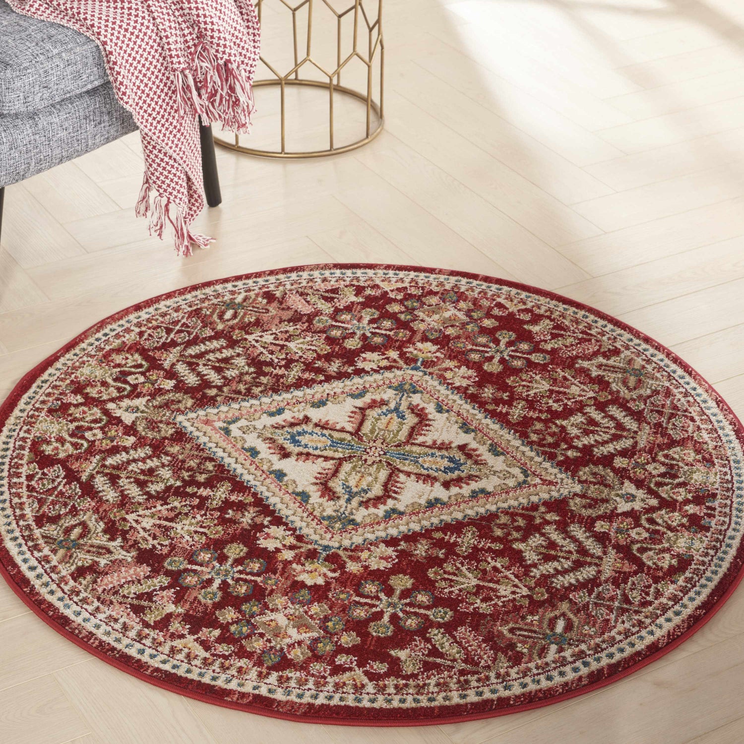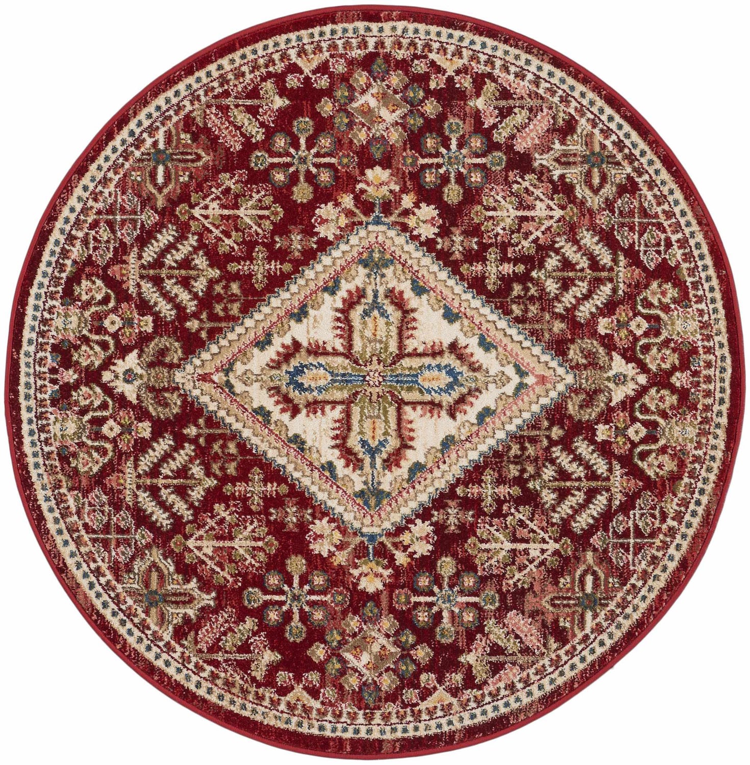 - Rich crimson red field with ivory diamond medallion centerpiece