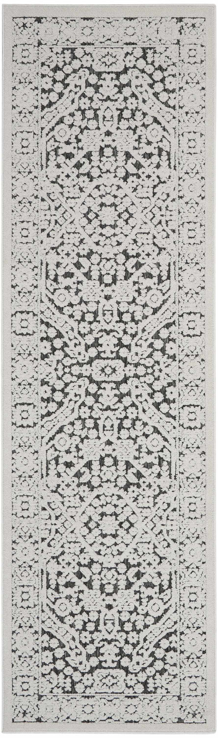 A rectangular runner rug with a deep charcoal and dark grey base overlaid with intricate silver-white traditional motifs. The design features a central repeating medallion arrangement surrounded by ornate floral and scrollwork elements, framed by a detailed multi-layered border with geometric and floral accents. The pattern is symmetrical and densely detailed, reminiscent of classic Persian or Oriental carpet design but rendered in a stark, cool grey-and-white palette. The pile is visibly low and tight, giving the surface a smooth, flat appearance with a slight sheen. Edges are cleanly bound with no fringe or tassels. The overall impression is of a sophisticated, monochromatic traditional rug with strong graphic contrast.