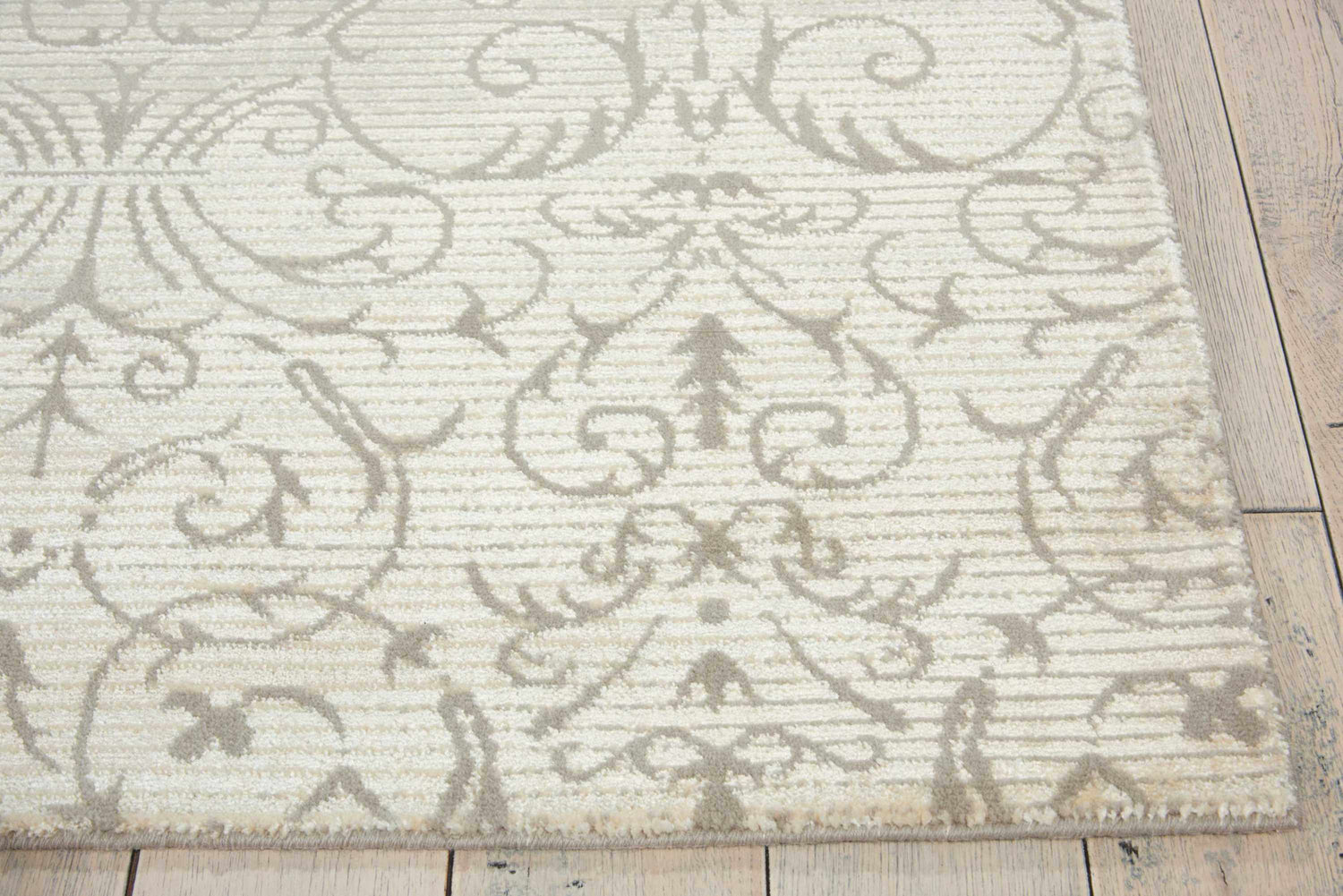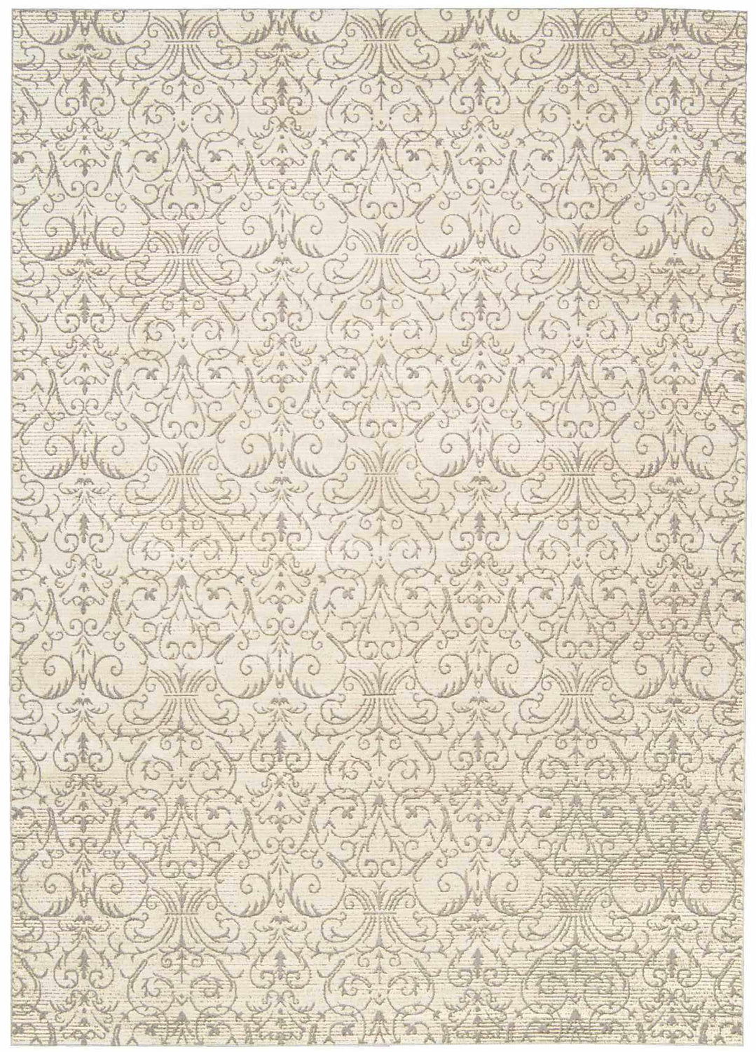 neutral paletteA warm ivory cream base with softly contrasting beige and tan scrollwork — the tone-on-tone palette is subtle and sophisticated, giving the rug a quiet, luminous quality that feels both timeless and fresh.