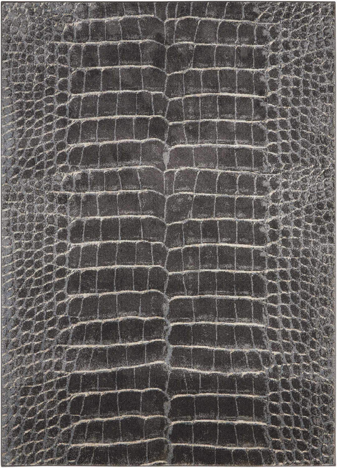 The Nourison Maxell area rug makes a bold, sophisticated statement with its striking crocodile skin-inspired pattern rendered in deep charcoal and smoky gray tones. The embossed, textured surface mimics the dimensional scales of reptile hide, giving it a tactile, three-dimensional quality that photographs beautifully and looks even more impressive in person. The dark, moody palette is anchored by a rich charcoal base with lighter gray highlights that trace the edges of each scale, creating natural depth and contrast across the entire surface. At 0.5 inches of medium pile, it offers a comfortable underfoot feel while maintaining the crisp definition of the pattern. The foam latex backing keeps it securely in place on hard floors. This rug works equally well as a dramatic focal point in a modern living room, a sleek home office, or a bold bedroom — anywhere you want to add texture and edge without introducing busy color. Its neutral charcoal palette means it pairs effortlessly with black, white, silver, and even warm wood tones.