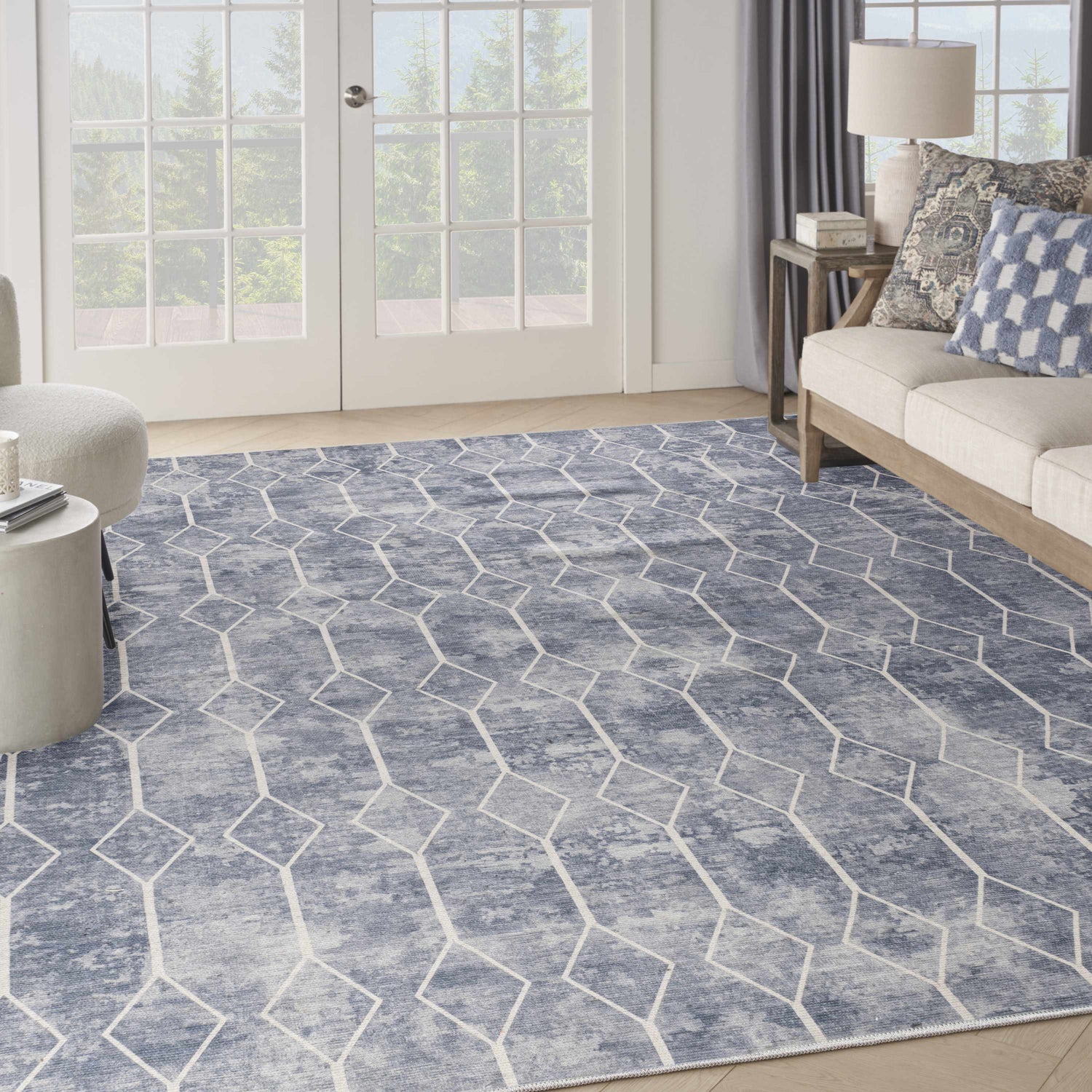 A cool blue trellis rug that's actually machine washable — modern geometric style meets everyday practicality with a rubber non-slip backing.