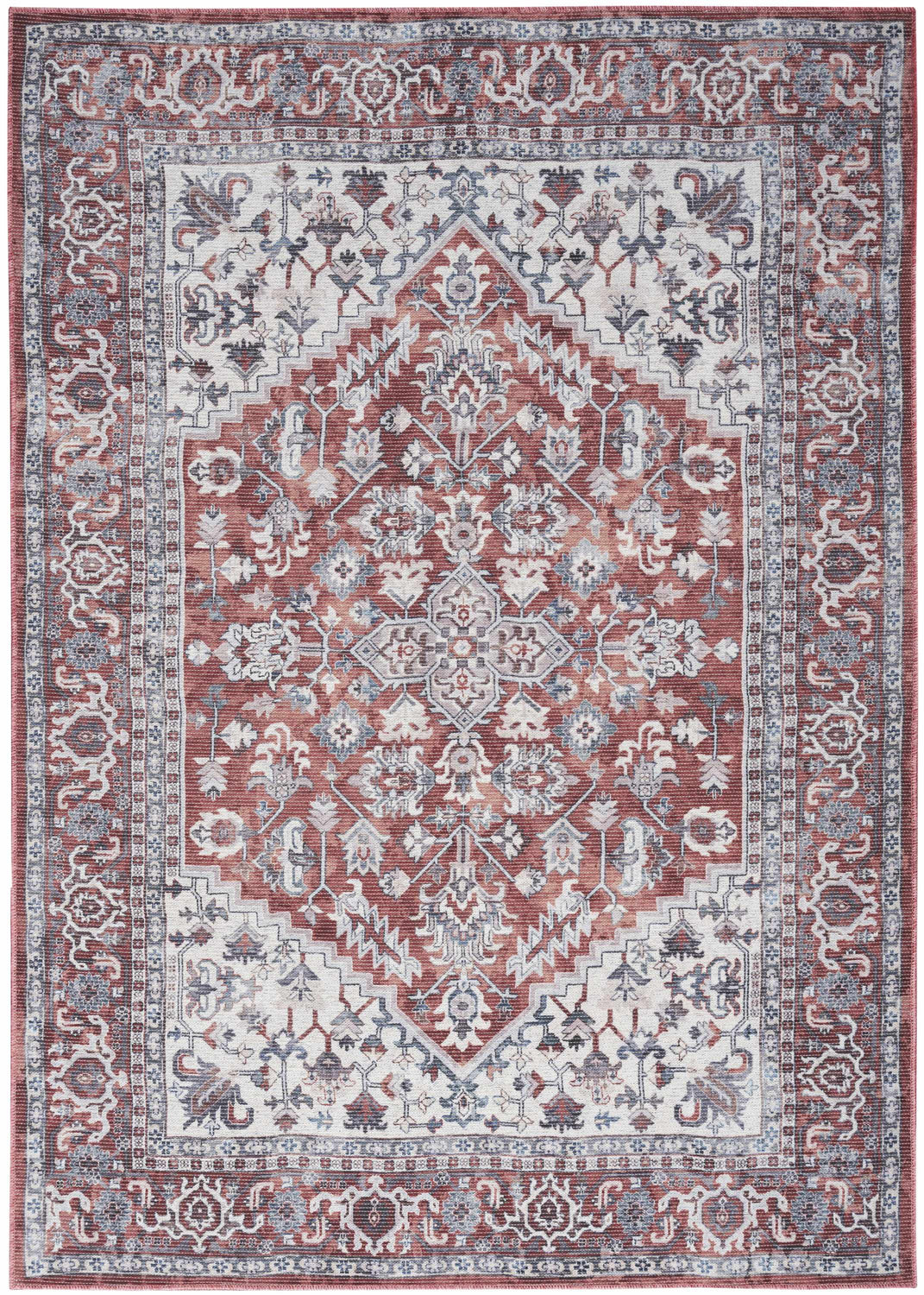 warm paletteA warm, earthy palette anchored by a dominant rust and brick-red field, softened by an ivory inner border and medallion center. Gray and dusty blue accents in the floral motifs add cool contrast, while the gently faded finish ties everything together into a rich, antique-feeling palette.