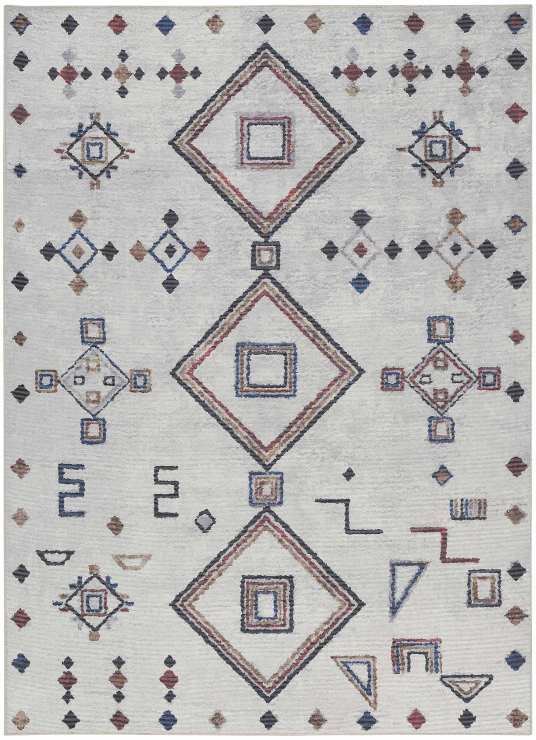 neutral paletteA bright ivory ground dominates the surface, with multicolor geometric motifs woven throughout in navy blue, dusty red, warm brown, and sandy beige — creating a rich, globally inspired palette that feels collected and eclectic without being overwhelming.
