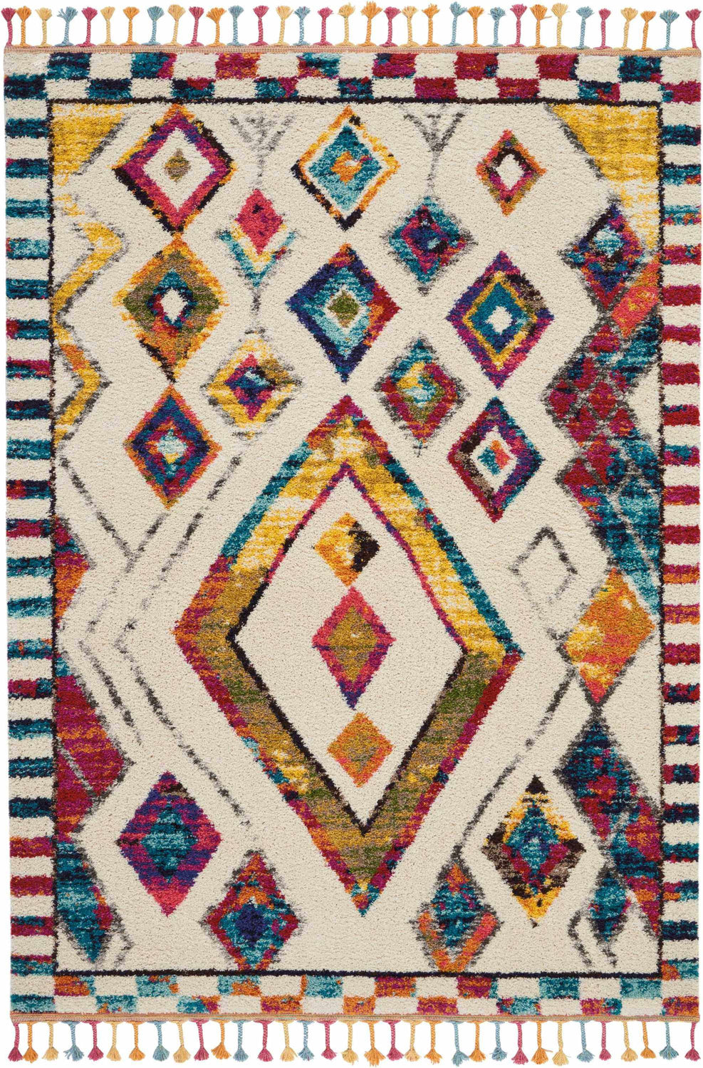 A rectangular high-pile shag rug with a creamy ivory base field. The surface is covered in an allover repeating tribal diamond and geometric motif pattern in vivid multicolors — red, yellow, cobalt blue, hot pink, teal, orange, and green — arranged in a nested diamond grid with a larger central medallion-style diamond at the center. The pile is thick and fluffy, approximately 0.75 inches, giving the surface a lush, textured appearance. All four edges are finished with colorful knotted tassels in a mix of yellow, orange, teal, pink, and blue. A thin geometric border frames the field on all sides. The overall impression is bold, festive, and handcrafted — reminiscent of a traditional Moroccan Berber rug rendered in a vivid, contemporary palette.