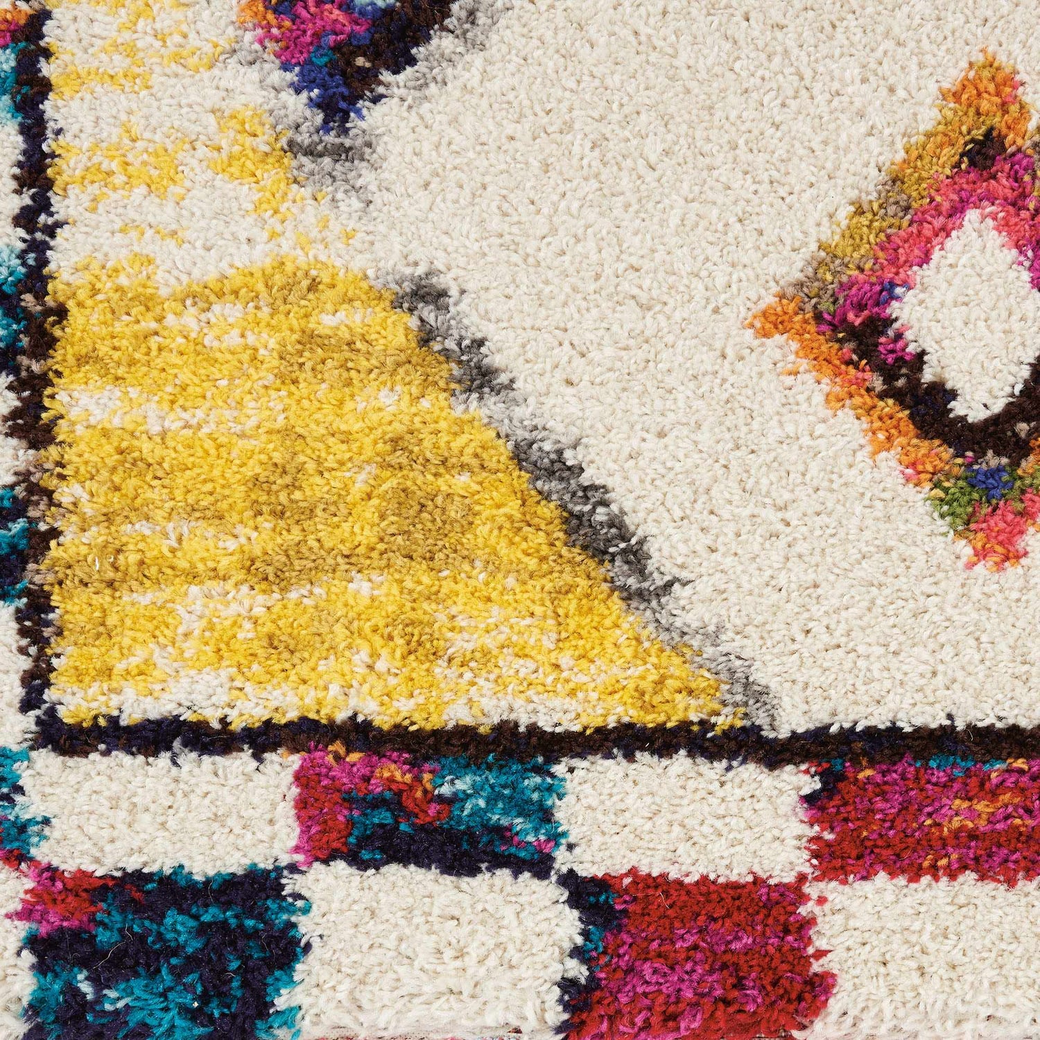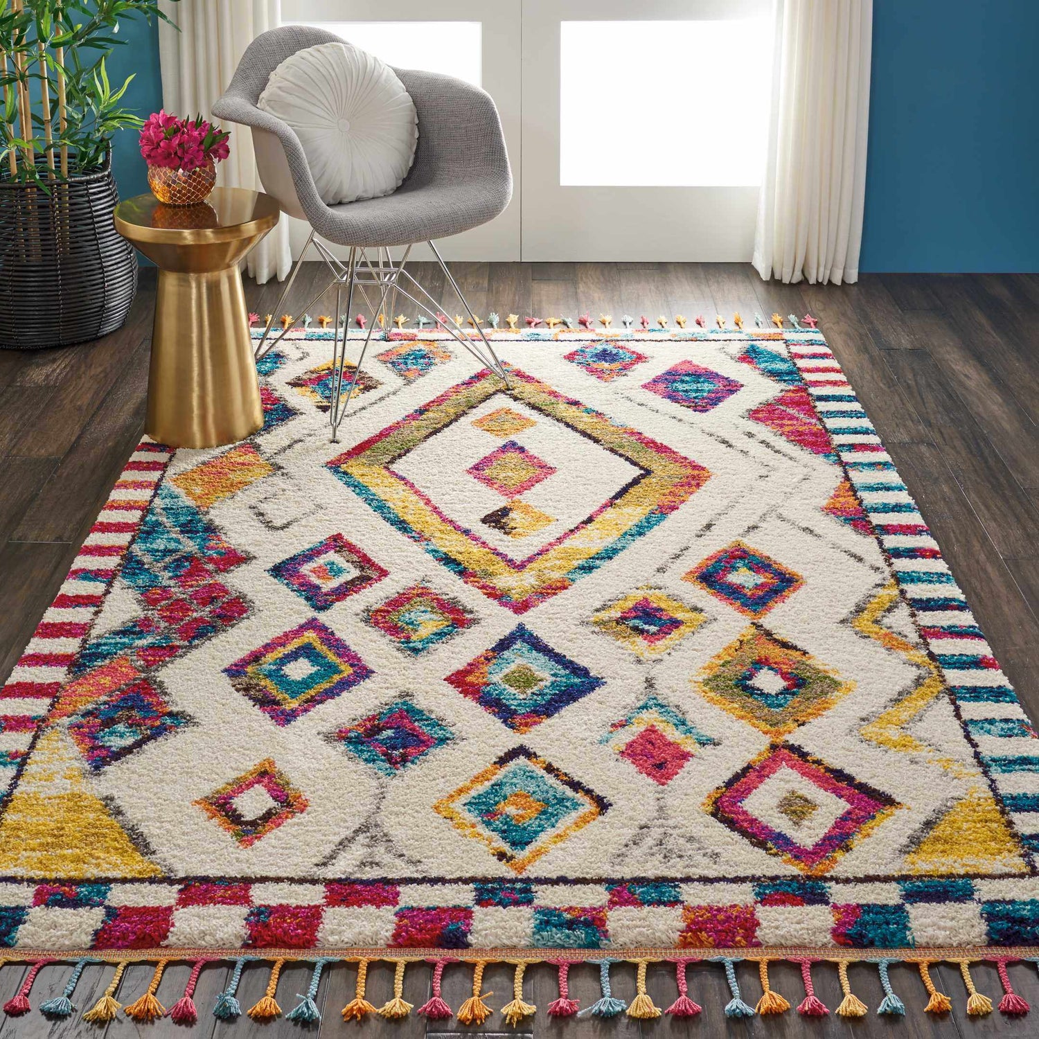 A vibrant explosion of color on a plush ivory shag — the Nomad's Moroccan tribal diamonds and rainbow tassels make it an instant room centerpiece.