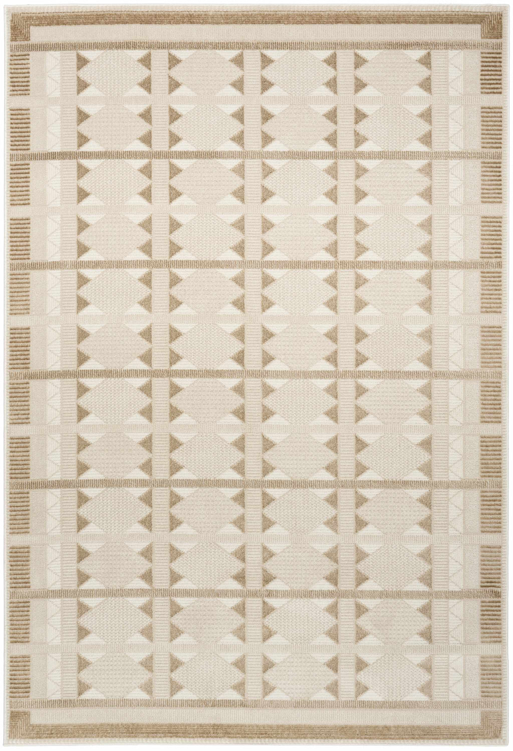 A rectangular runner rug with a warm cream base and soft taupe/beige geometric patterning throughout. The design features repeating rows of diamond and triangle motifs arranged in a grid-like column layout, creating a structured, Scandinavian-inspired look. A clean rectangular border frames the entire field, with subtle linear striping at the edges reinforcing the geometric theme. The pile is low and smooth with a machine-woven surface texture — no fringe, no tassels, bound edges. The overall visual impression is calm and neutral, like a woven linen textile with quiet geometric detail.
