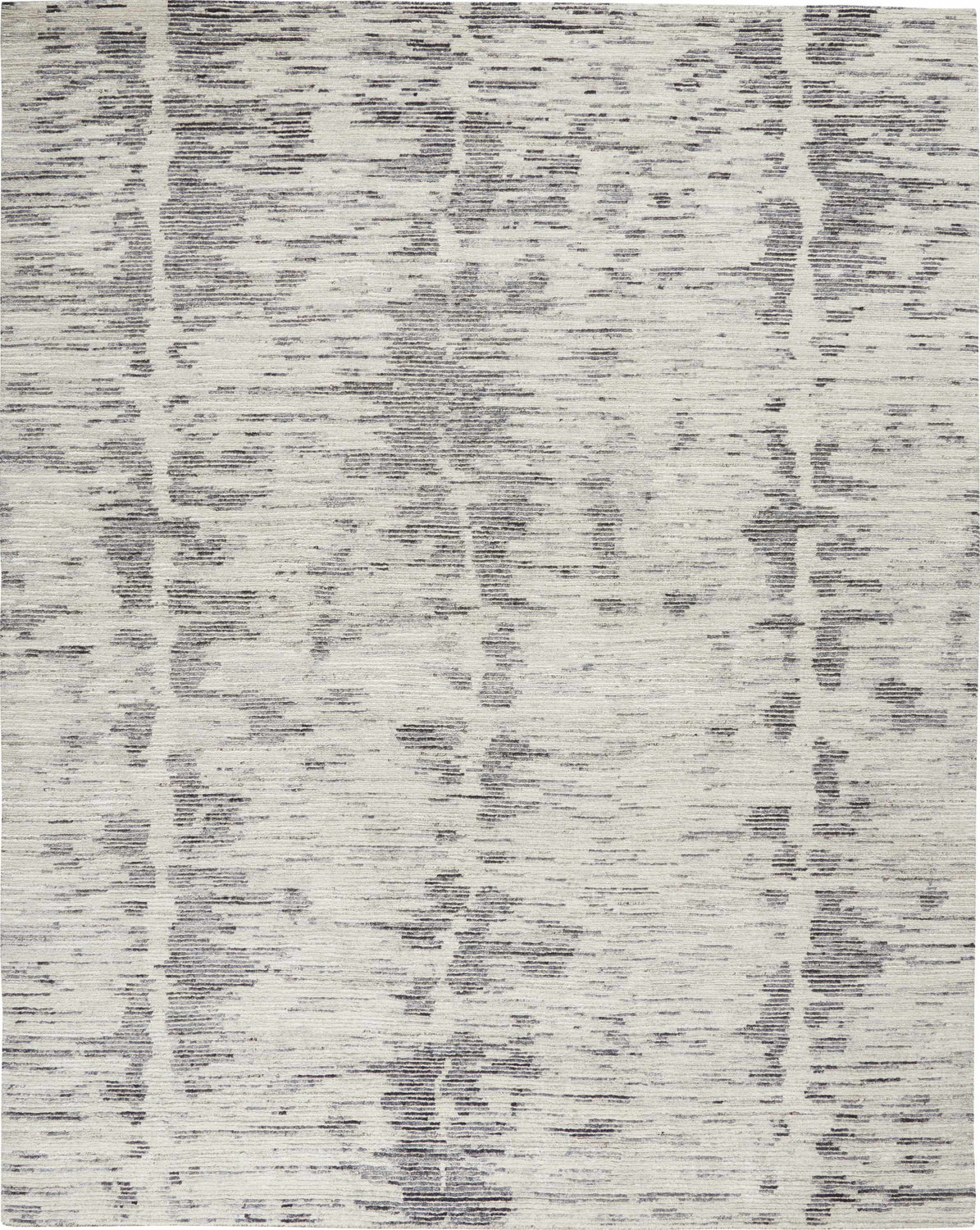 A rectangular area rug with a warm cream/off-white base field. Across the entire surface, broken horizontal charcoal and medium gray strokes are layered in varying densities — shorter, more fragmented toward the outer edges and denser, more concentrated toward the vertical center, creating a subtle elongated diamond or hourglass focal point without a hard border. The strokes have a hand-drawn, brushstroke quality rather than crisp geometric lines. The pile is medium height with a slightly textured, woven surface that gives the rug visual depth. Edges are cleanly bound with no fringe or tassels. The overall impression is of a calm, abstract, modern textile with quiet movement and tonal sophistication.