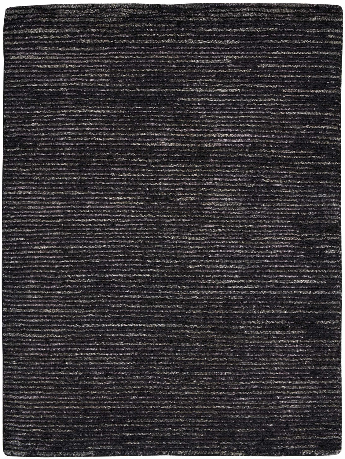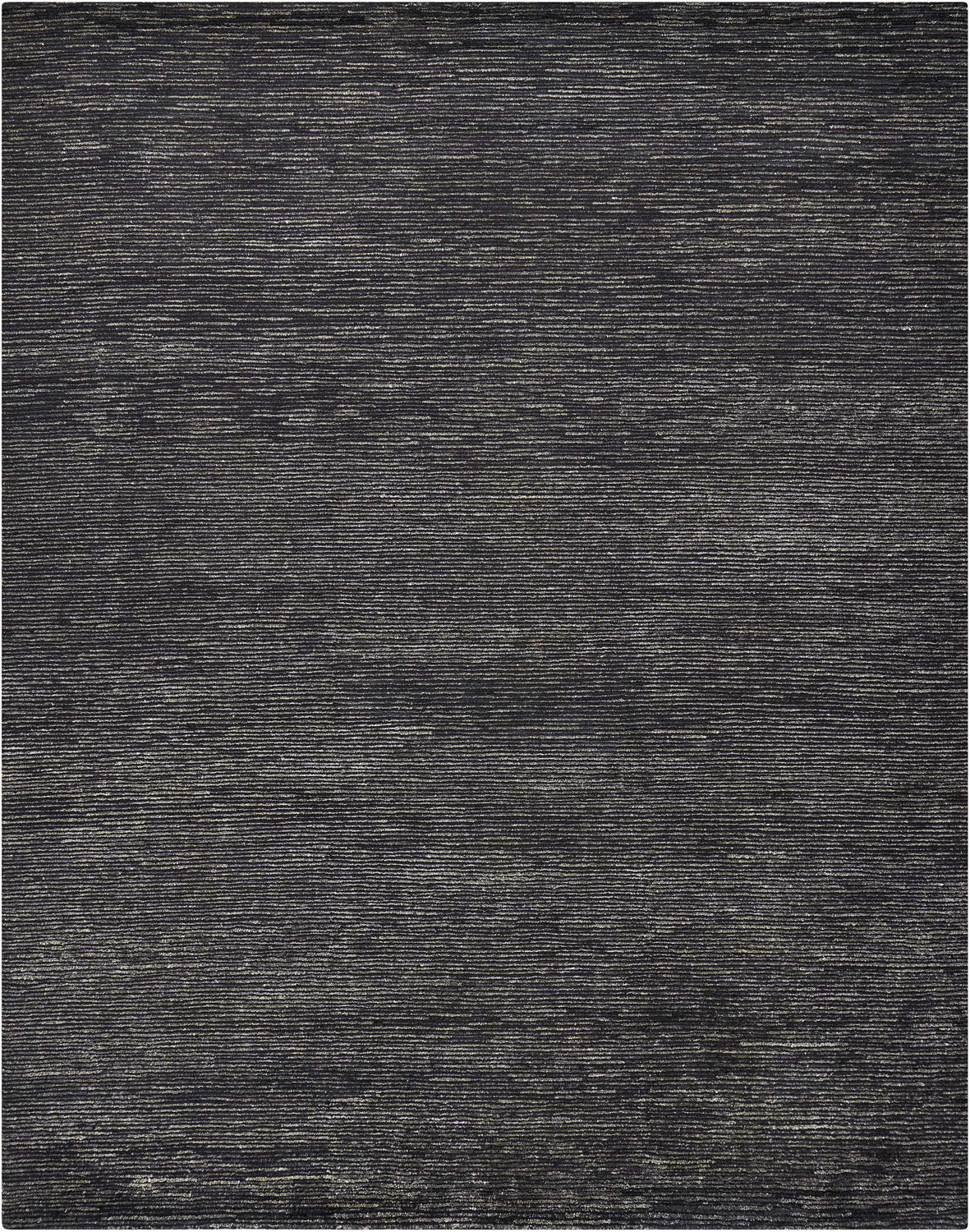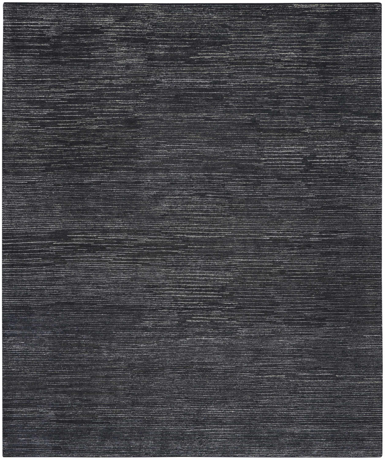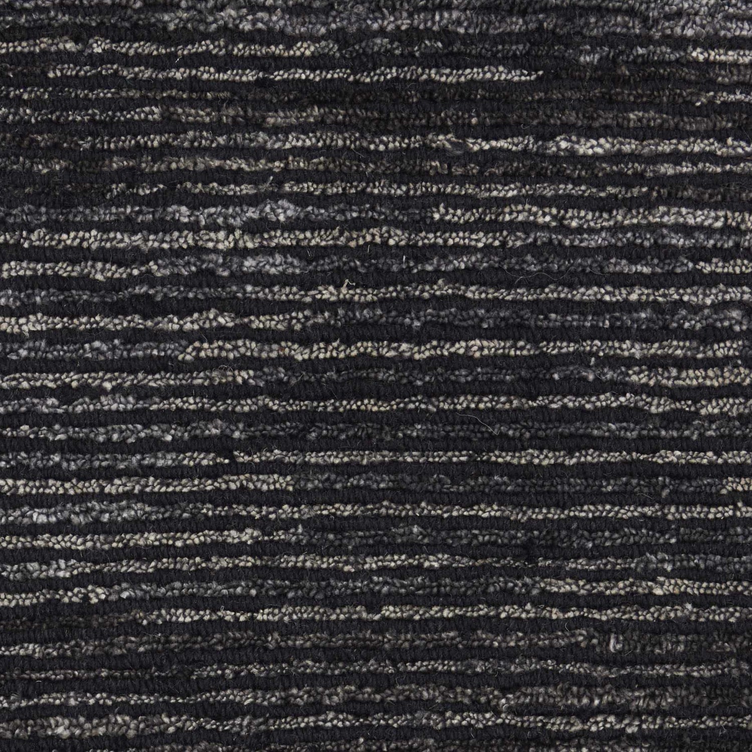 A rectangular area rug with a deep, near-solid black base covering approximately 70% of the surface. Subtle horizontal striations in charcoal and dark gray run across the entire rug in a broken, organic linear pattern — not perfectly straight lines but slightly irregular, giving the surface a woven, textural quality reminiscent of brushed fabric or calm water. The pile is medium height (0.5 inch), smooth and uniform in appearance with no shag or loops visible. Edges are cleanly bound with no fringe or tassels. The overall impression is of a very dark, quietly textured rug that reads as near-solid black from a distance but reveals tonal depth up close.