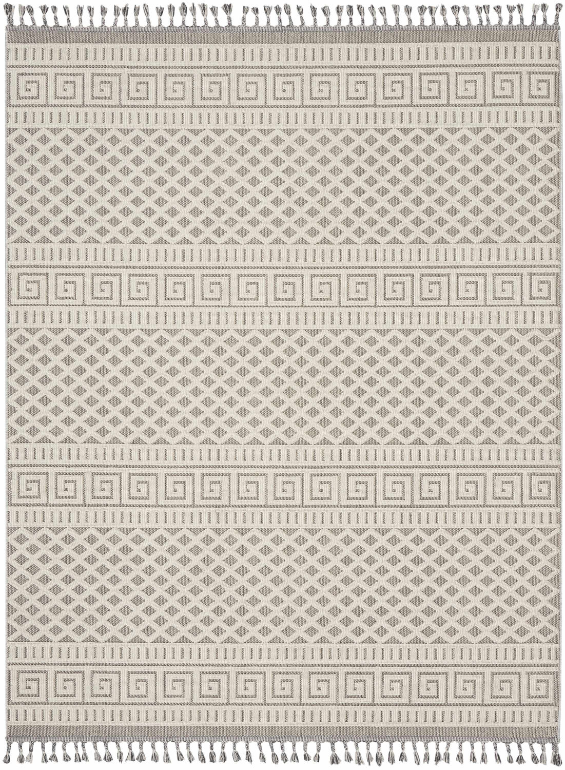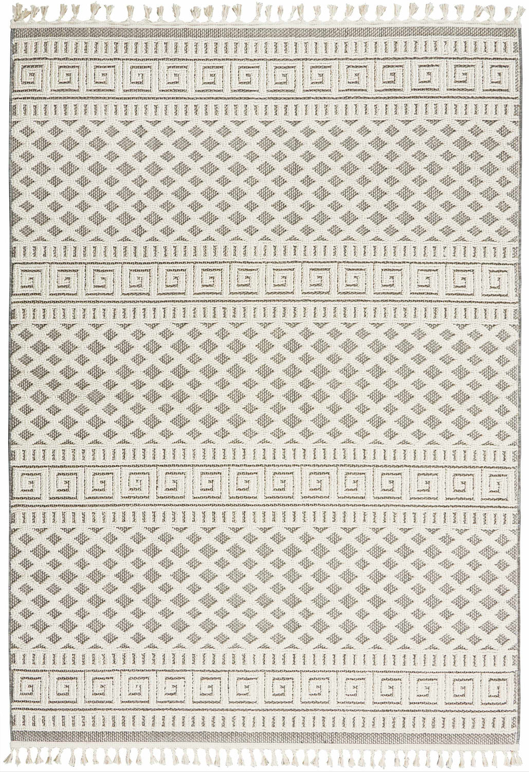 A rectangular area rug with a soft ivory/cream base and warm gray geometric patterning throughout. The field is filled with a repeating allover pattern of small diamond shapes arranged in a grid. Horizontal bands of classic Greek key (meander) motifs divide the rug into sections, creating a structured, layered look. The border repeats the Greek key pattern along all four edges. The pile is low to medium, with a smooth, tightly woven texture. At each of the four corners, clusters of knotted ivory tassels hang approximately 2-3 inches, adding a relaxed handcrafted finish. The overall impression is clean, classic, and quietly elegant — a neutral geometric rug with just enough detail to be interesting.