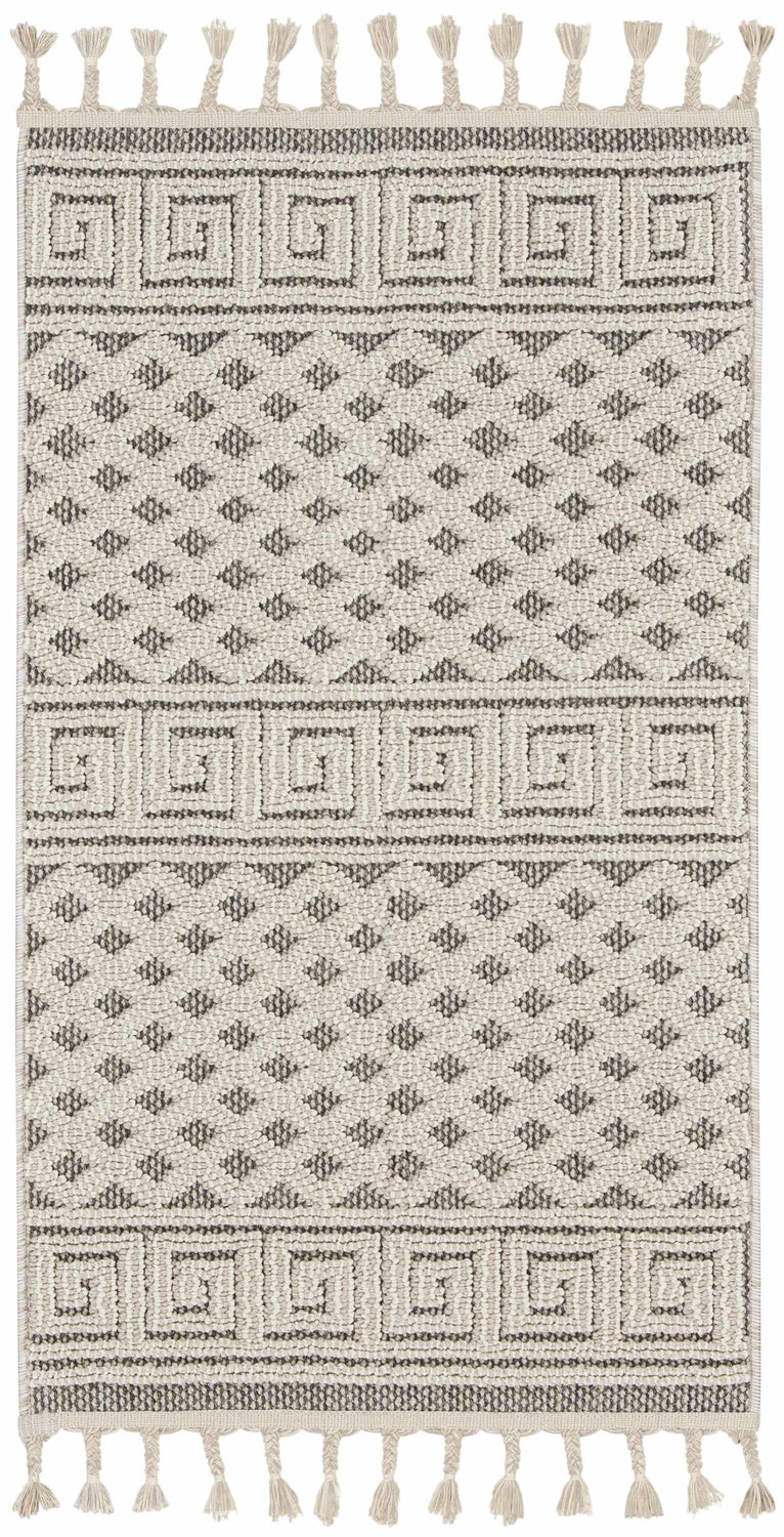 Classic Greek key borders meet repeating diamond motifs in a soft ivory and gray palette — the Paxton brings structured elegance and boho tassels together in one versatile rug.