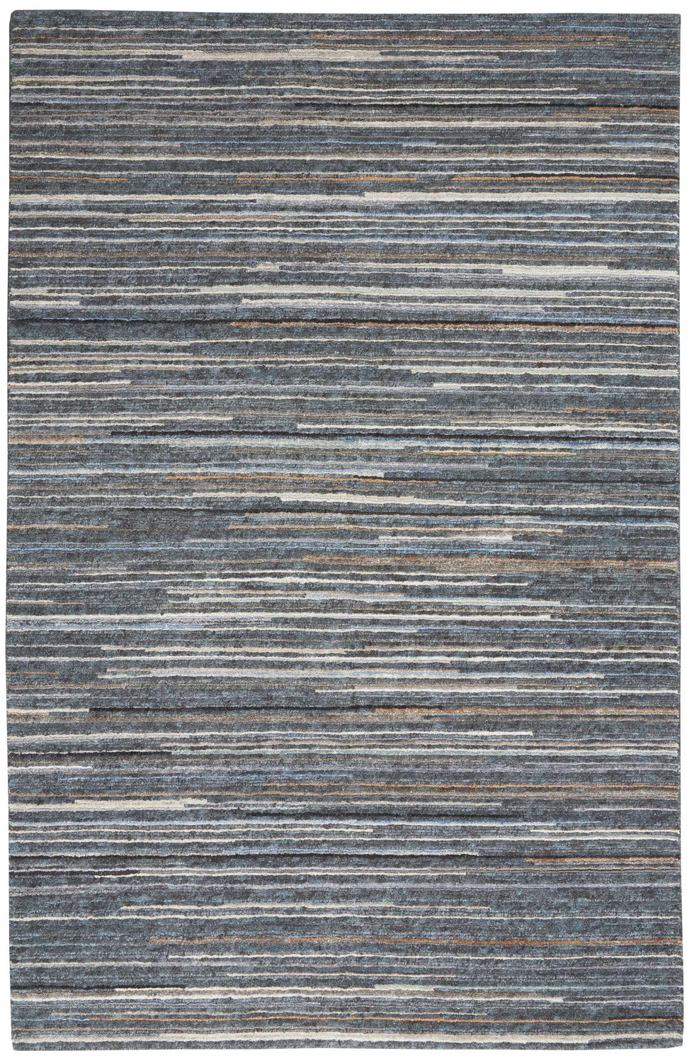 A rectangular area rug featuring irregular, organic horizontal stripes running the full width of the rug in a broken, painterly style. The dominant colors are slate blue and charcoal gray, interspersed with stripes of cream/off-white, warm brown, and rust orange accent lines. The stripes vary in width and are not perfectly uniform — they have a hand-painted, slightly uneven quality that gives the rug an abstract, artistic feel. The pile is medium height with a slightly textured, dense surface. Edges are cleanly bound with no fringe or tassels. The overall impression is of a sophisticated, modern abstract stripe rug with a cool-dominant but earth-accented palette.