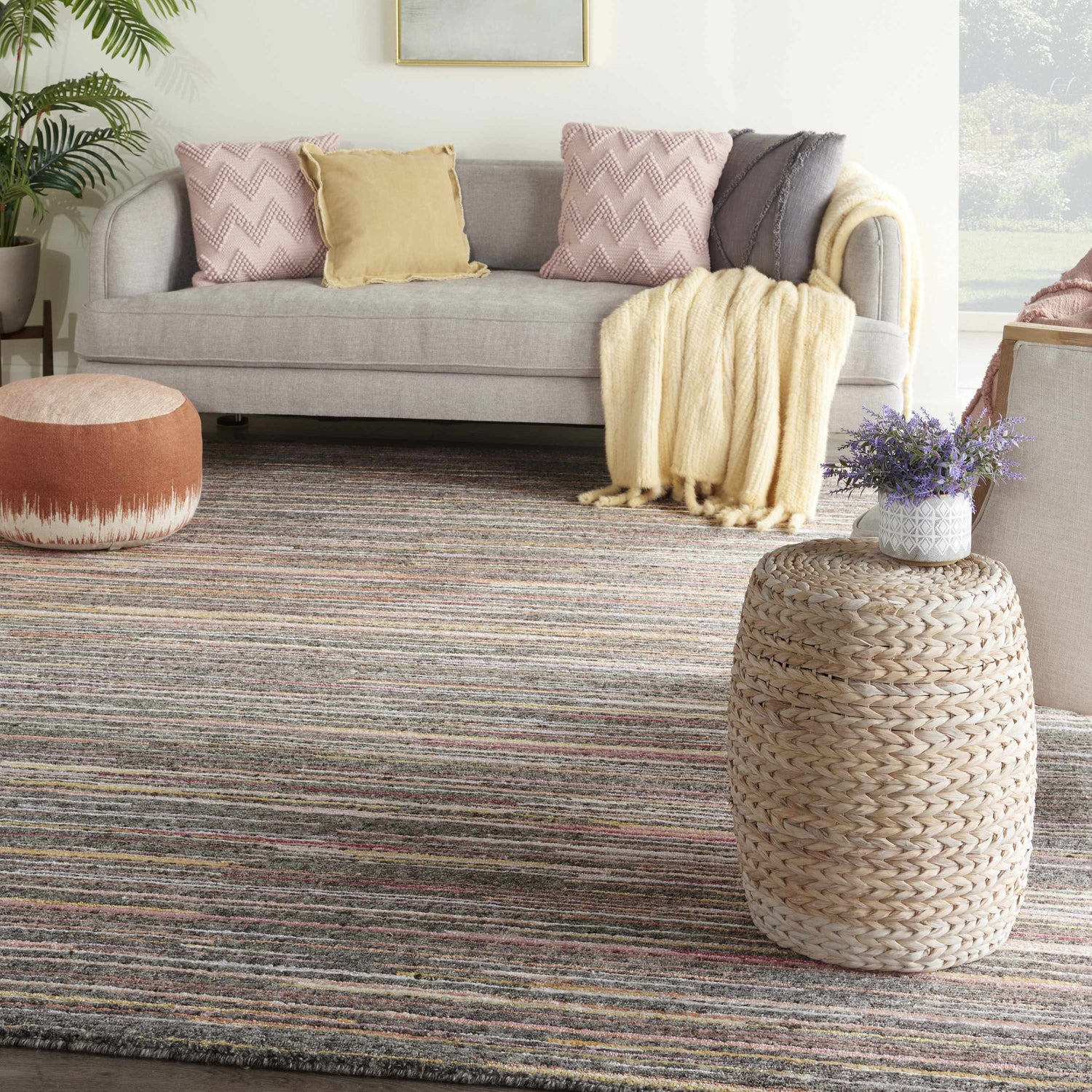 Horizontal stripes in gray, coral, rust, and gold give the Nourison Plateau a textured, modern look that works in almost any room — understated but never boring.