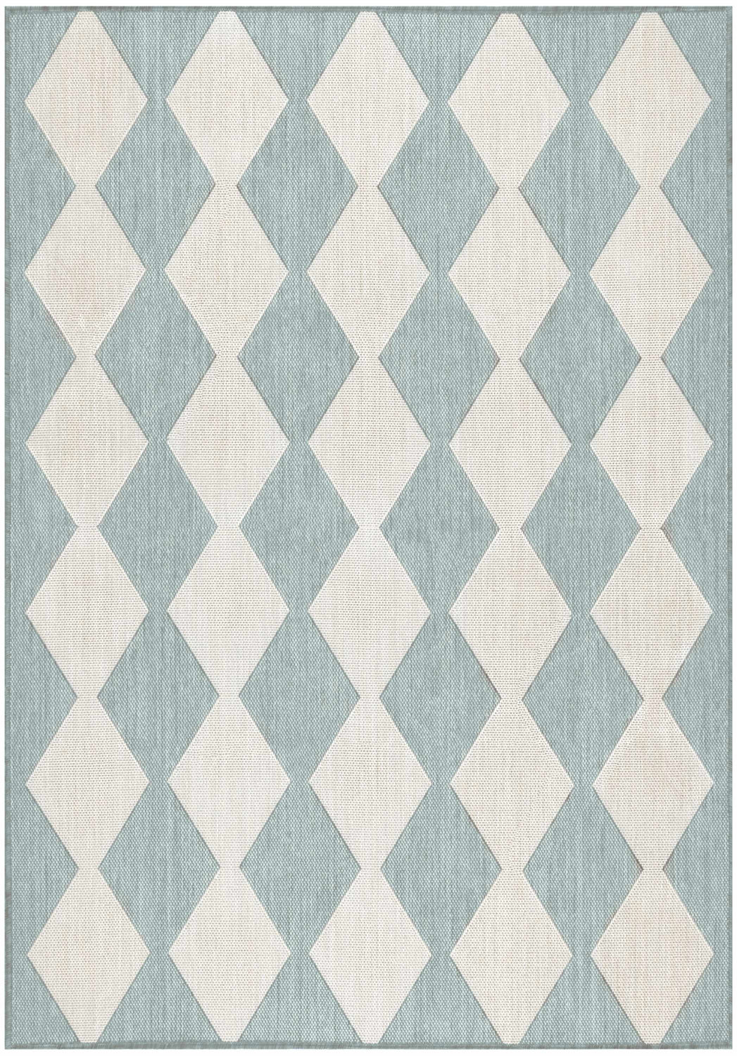 A crisp harlequin diamond pattern in soft aqua and cream — the Nourison Positano is a weather-resistant polypropylene rug that looks sharp on patios, porches, or any high-traffic space.