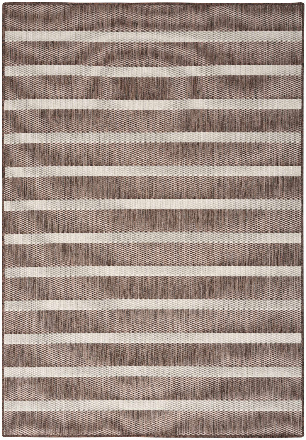 warm paletteWarm medium brown dominates the field, interrupted by evenly spaced cream-white horizontal stripes that give the rug a crisp, nautical-meets-natural feel. The overall palette is earthy and grounded without feeling heavy.